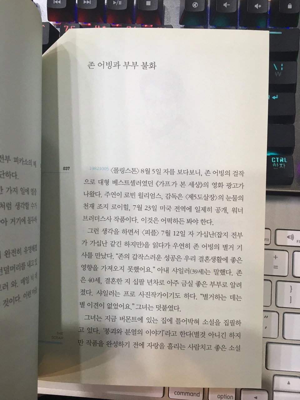 그래서 이 책을 보면 80년대의 이야기들이 가득하다. 다른 에세이들과 또 다른 책이 이 책 ‘더 스크랩’이다. 그중에 존 어빙의 챕터를 보면 마흔의 존 어빙이 별거한 이야기를 하루키가 하고 있다.