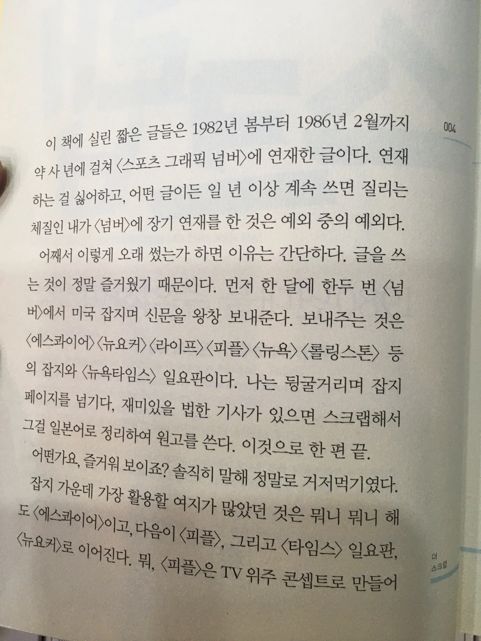 하루키의 ‘더 스크랩’은 하루키의 에세이 중에서도 무게로 따지면 가벼운 글이다. 에세이 ‘작지만 확실한 행복’보다는 무게가 있고 ‘먼 북소리’보다는 가벼운 책이다. 내용면으로 그렇다는 말이다. 가방에 넣어 다니다가 버스를 기다릴 때 꺼내서 아무 페이지나 펴서 읽기에 좋은 책이다. 이 책은 두 번째 사진에서 설명을 잘해놨다. 이런이런 책인 것이다.