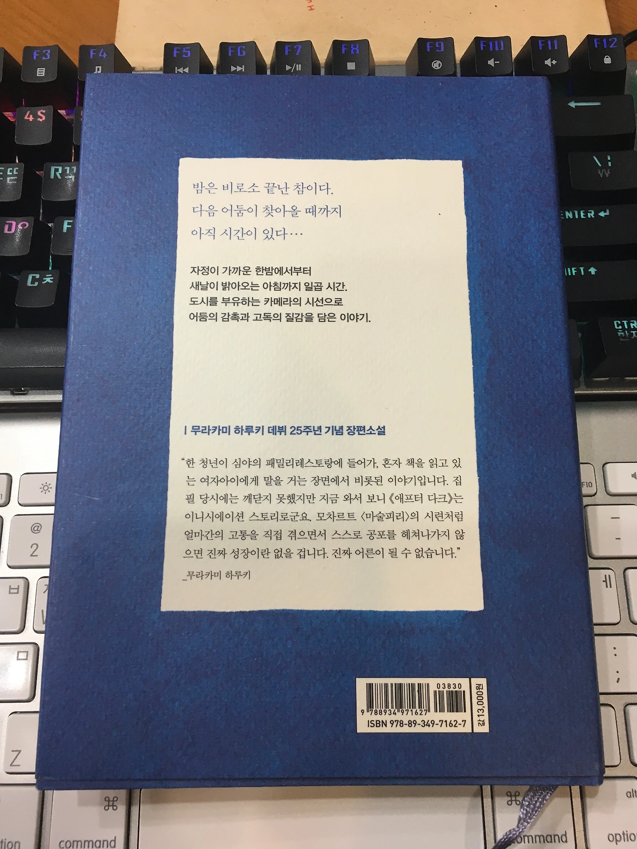 어둠의 저편이든, 애프터 다크든, 아무튼 좋은 소설이었다. 번갈아 가며 읽으면 번역이 조금 다른 부분도 재미있게 읽을 수 있다. 요컨대 ‘~~~ 하지 않으면 안 된다’와, ‘~~~~ 해야만 한다’ 같은 차이를 느낄 수 있다.