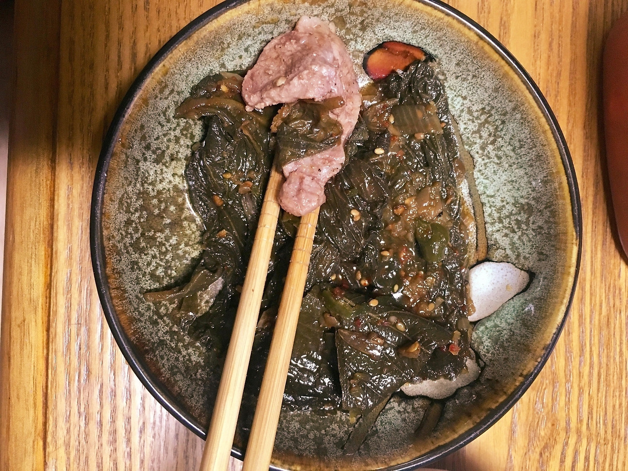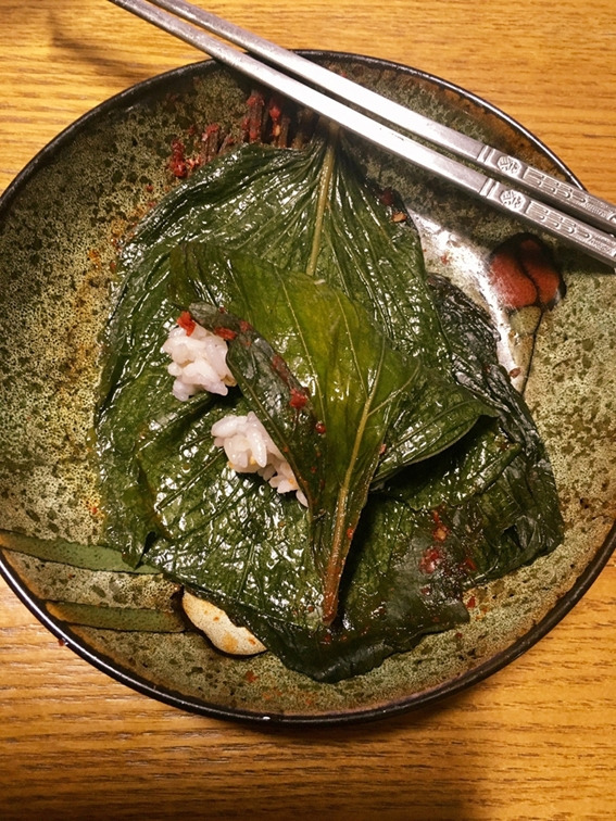 깻잎의 문제라면 이렇게 밥과 함께 먹으면 밥을 너무 먹게 된다고 한다. 먹을수록 더 배가 고파지는 희한한 음식이 깻잎이다. 고기를 구우면 역시 깻잎에 싸서 먹으면 맛있다.