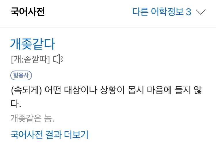 개좆 같다, 는 말은 표준어다. 우리는 흔히 표준어를 써야 한다고 배운다. 그래서 욕을 할 때에도 이렇게 표준어를 구사하면 표준어가 아닌, 우리가 하위 언어로 인정하는 욕보다 괜찮다는 느낌을 받을 수도 있다. 개좆 같다. 의 해석도 찰지다. 어떤 대상이나 상황이 몹시 마음에 들지 않는다는 말이다. 발음도 표준어니까 표기를 잘해놨다.