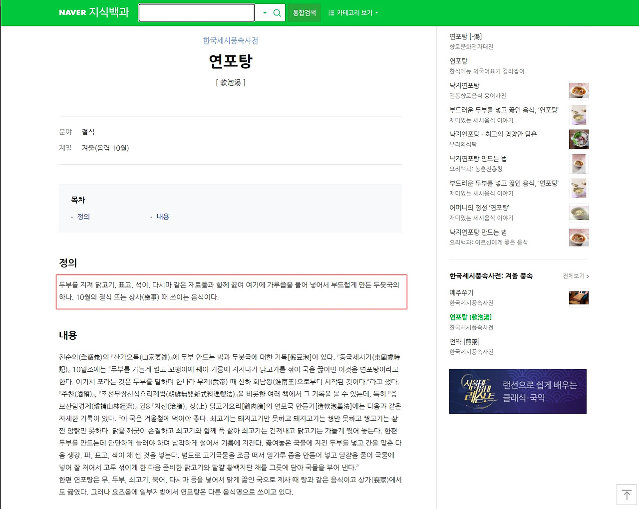 연포탕은 두부를 가지고 조리한 국 또는 탕을 말한다. 연포탕에 관한 이야기도 많이 했지만 또 해보자면, 연포탕의 정의는 두부를 가지고 여러 식재료와 함께 끓여서 만든 두붓국의 하나라고 되어 있다. 나는 두부를 좋아해서 두부를 거의 매일 먹는다. 매일 먹는 두부이다 보니 같은 조리로 매일 먹기는 싫기도 하고, 그래서 굽고, 튀기고, 지지고 볶거나 그냥 그대로 뜨겁게 해서 먹기도 하는데, 이상하게도 두부가 가장 맛있는 것은 탕에 풍덩 빠졌을 때다.