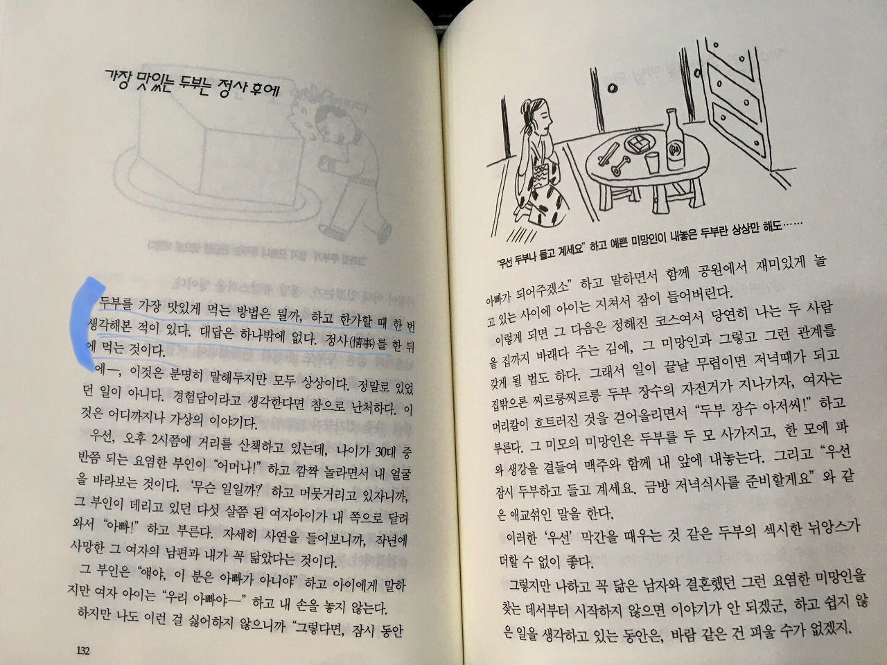 또 하루키는 ‘가장 맛있는 두부는 정사 후에’ 먹는 것이라고 에세이에 말하고 있지만 끝까지 읽으면 반전이 있다. 하루키의 말대로 일본에서 맛있는 두부 집들이 하나씩 사라지기 시작해서 자취를 감추었다고 했는데 그게 80년대다. 정말 그럴까. 집에서 두부를 거의 매일 먹다가 예전에 일본에 한 번 가서 거기서 두부를 한 번 사 먹었는데 도대체 나는 그동안 뭘 먹은 거지? 했던 기억이 있다. 후배와 타 지역에 여행을 가서 배고 고파서 들어간 식당이 오색두부를 파는 곳이었는데 먹어봐야 두부일 뿐인데 두부 치고 가격이 비싸서 놀랐던 기억도 있다.