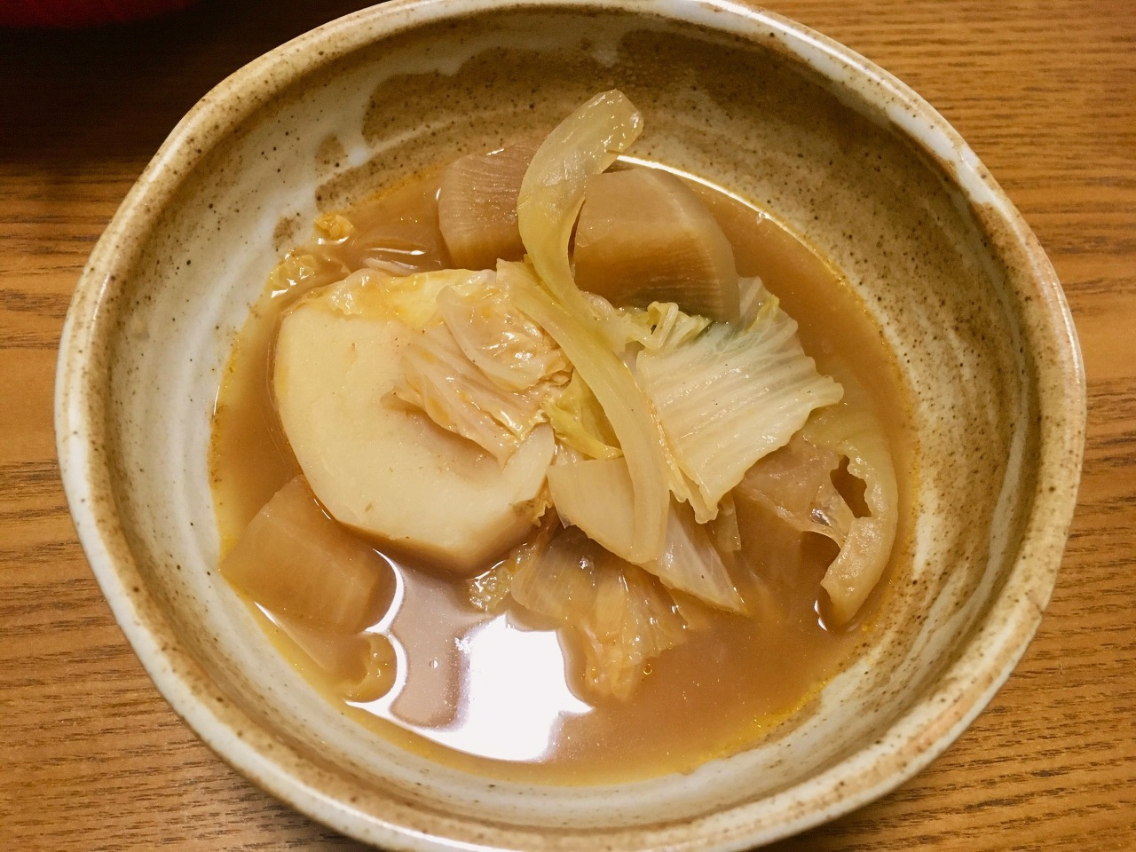 깍두기와 감자를 넣어서 끓인 된장국. 외할머니도 없고, 외숙모도 없도 시골집 냄새도 나지 않지만 된장국에 깍두기를 넣어서 비를 보며 먹다 보면 미소가 인다.