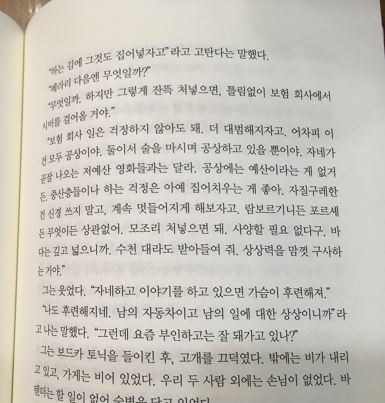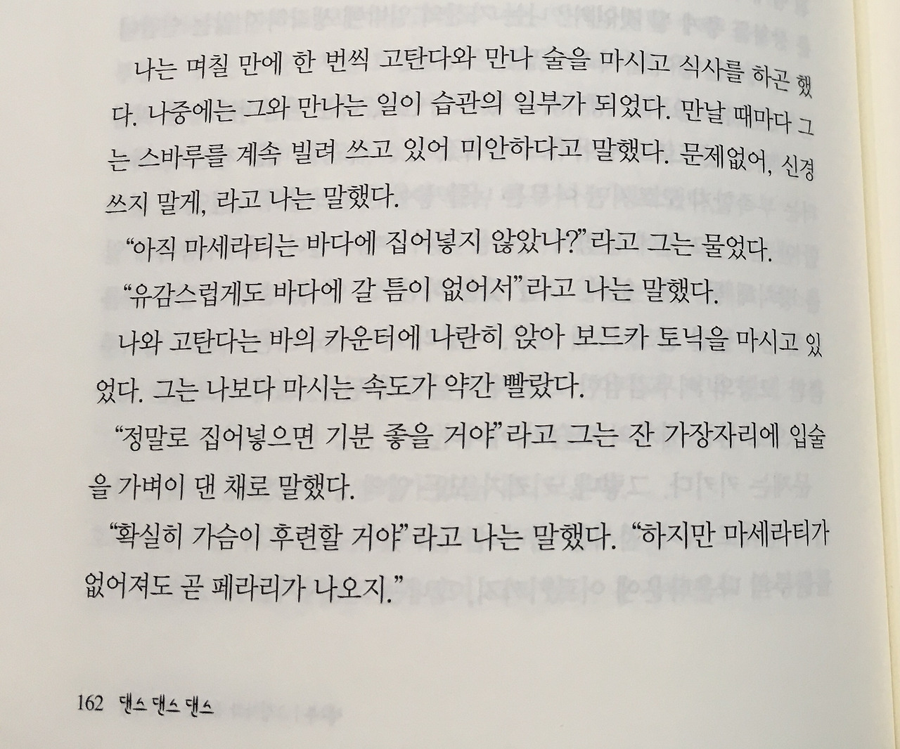 나는 곽재용 감독이 하루키의 댄스 댄스 댄스를 아주 좋아했을 것이라 생각한다. 그리고 주인공과 고탄다의 이 부분이 아마도 마음속 깊게 못을 박지 않았을까 생각도 한다. 곽재용 감독의 영화는 하루키의 소설처럼 안 그런 척 하지만 대부분 판타지, 초현실 이야기다. 기묘하면서 아름답고 현실적이지만 현실에서 약간 기울어진 이야기가 많다. 댄스 댄스 댄스에서 고탄다는 죽음으로 해서 제대로 된 스텝을 밟을 수 있게 되었을까. 읽을 때마다 느낌이 다른 댄스 댄스 댄스였다.