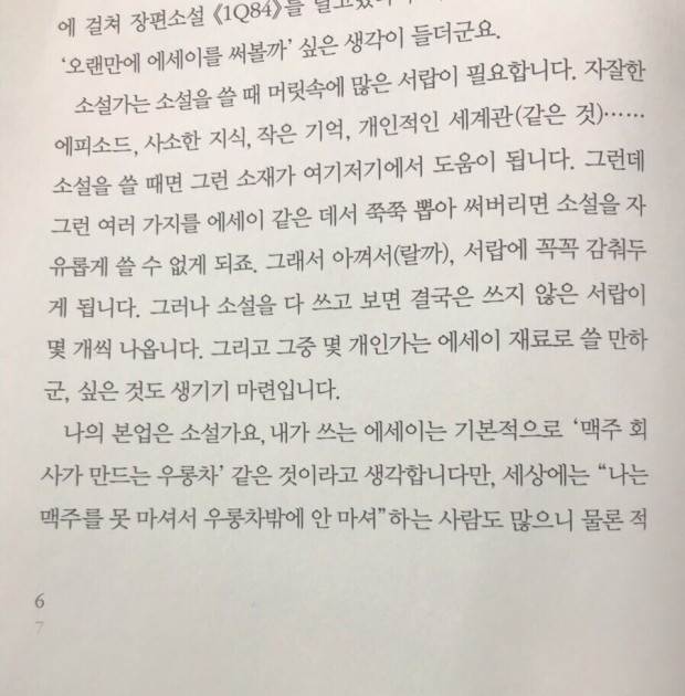 하루키 마니아들은 당연하게도 하루키의 소설을 먼저 접하고 소설을 읽으며 중간중간 에세이를 읽었기에 어쩌면 소설 쪽으로 마음이 더 가 있을지도 모른다. 잘 설명은 할 수 없지만 손으로 들고 더 자주 읽는 건 에세이인데도 하루키 하면 에세이는 2등이고 소설이 먼저야 라는 생각이 지배를 해버릴지도 모른다.