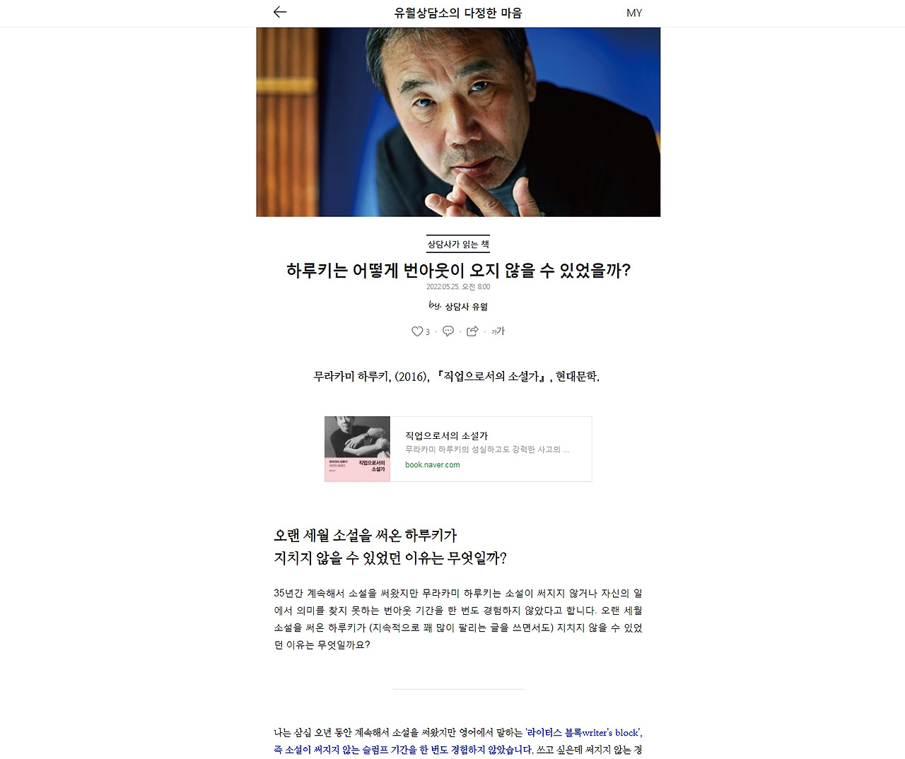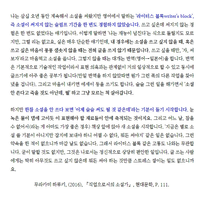 하루키에 대한 흥미로운 기사가 떴다. 하루키는 어째서 번 아웃 없이 계속 작품을 써내는가? 하는 것이다. 하루키는 ‘직업으로서의 소설가’에서 이에 대해서 언급했다.