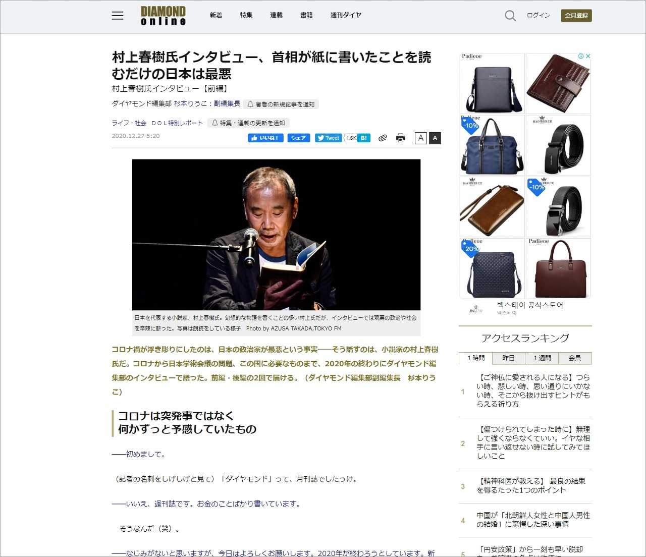 하루키는 일본의 주간지와의 인터뷰에서 팬데믹 상황이 하루키 자신의 창작활동에 영향을 주는 것인지, 그리고 일본 정치인들에 대해서 이야기를 했다. 엄청난 의역, 내 마음대로 살을 붙이거나 떼 버려서 썼다는 점.