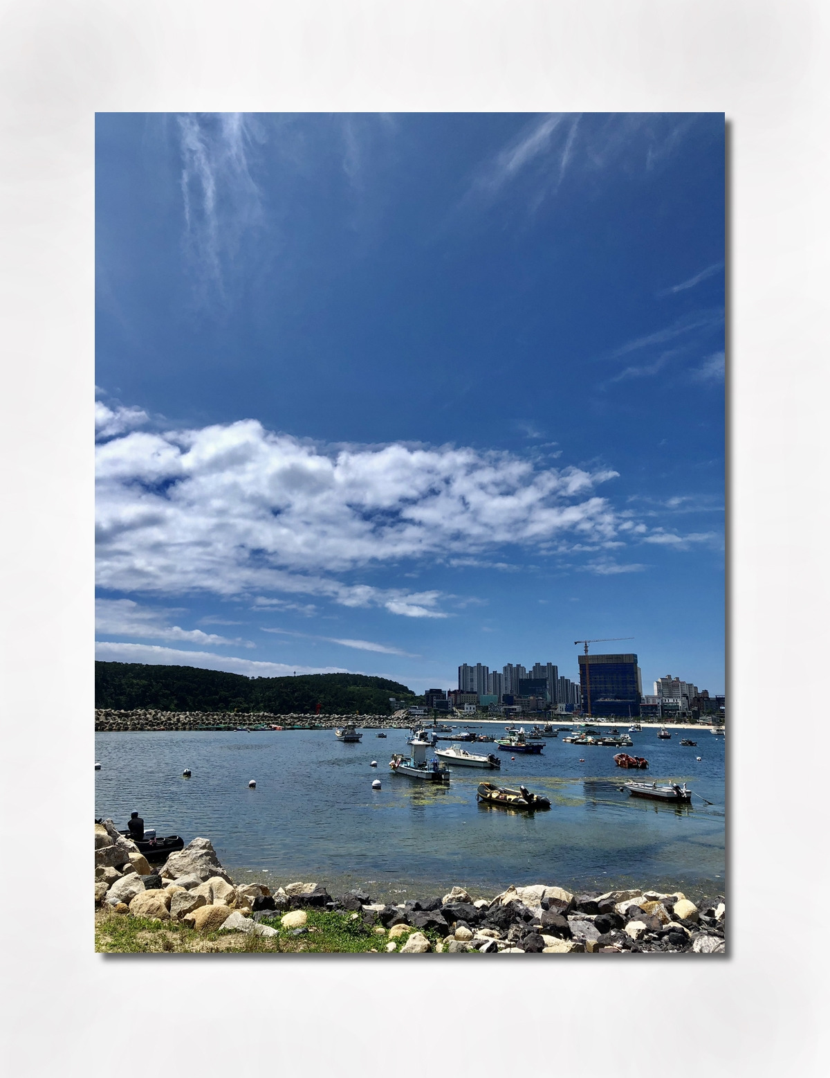 집 앞 바닷가에서 오전에 책을 좀 읽으며 한 컷 담았다. 아주 맑았다. 대기에 가스층이 거둬져서 하늘은 더욱 파랗게 보이고 구름은 더더 하얗게 보이는 그런 날이다. 이렇게 평온하게 보이지만 바다에는 바람이 심하게 분다. 그리고 바람은 춥다. 저어기 공사하는 건물 옆에 시지브이 극장이 생겼다. 이곳으로 여행을 온 사람들이 극장에서 영화를 보고 나왔을 때에는 아, 우리 여행 중이었지, 하며 더 재미있을 수도 있다. 내가 여행을 가면 꼭 그 도시나 그곳의 극장에서 영화를 보고 그런 느낌을 잔뜩 받았었다.