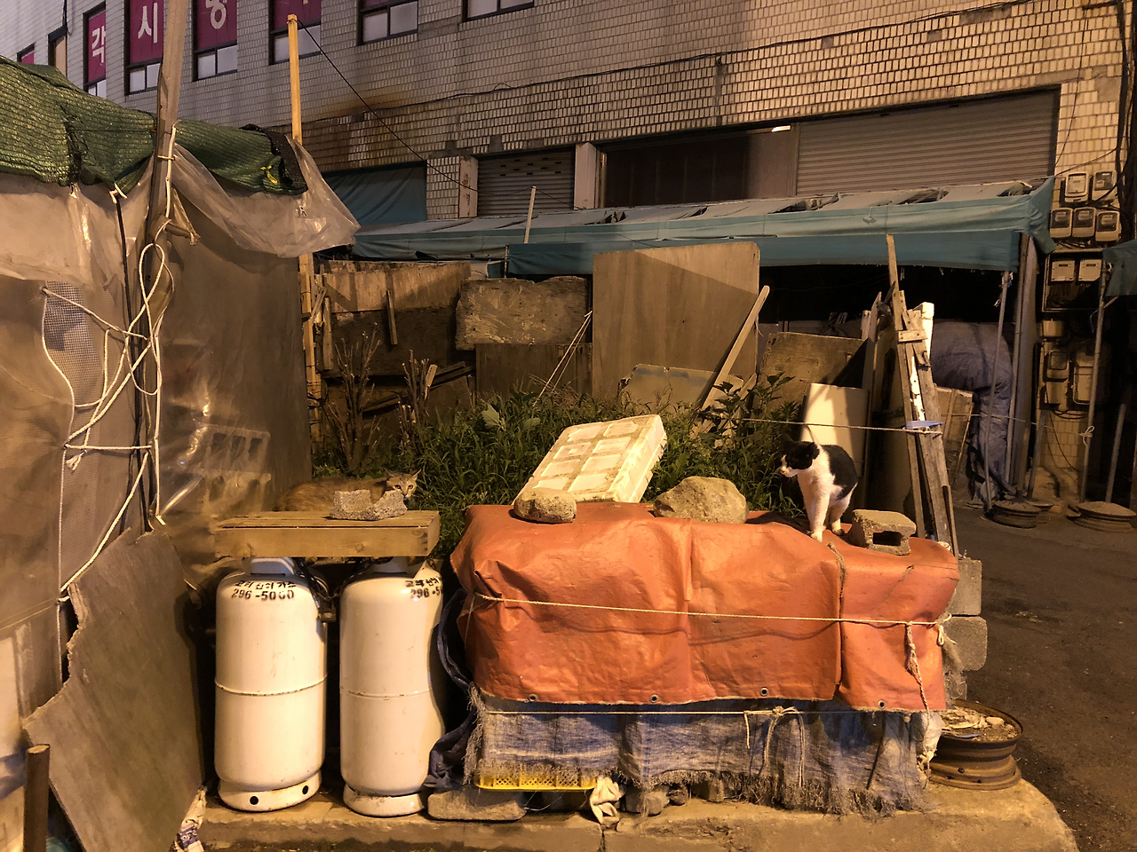 또 다른 골목에서는 고양이 한 마리가 구애를 하고 한 마리를 흥 하며 대치를 이루고 있다. 고양이는 몇 천 년 동안 정말 변함없이 자기중심적이라고 하지만 인간 품으로 파고드는 고양이 앞에서는 또 속수무책이다.