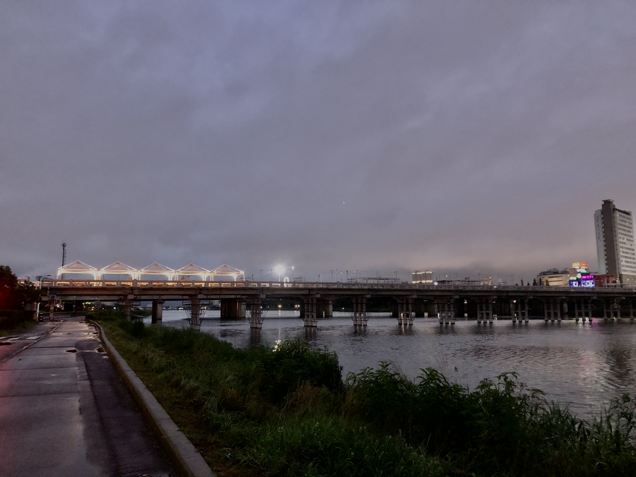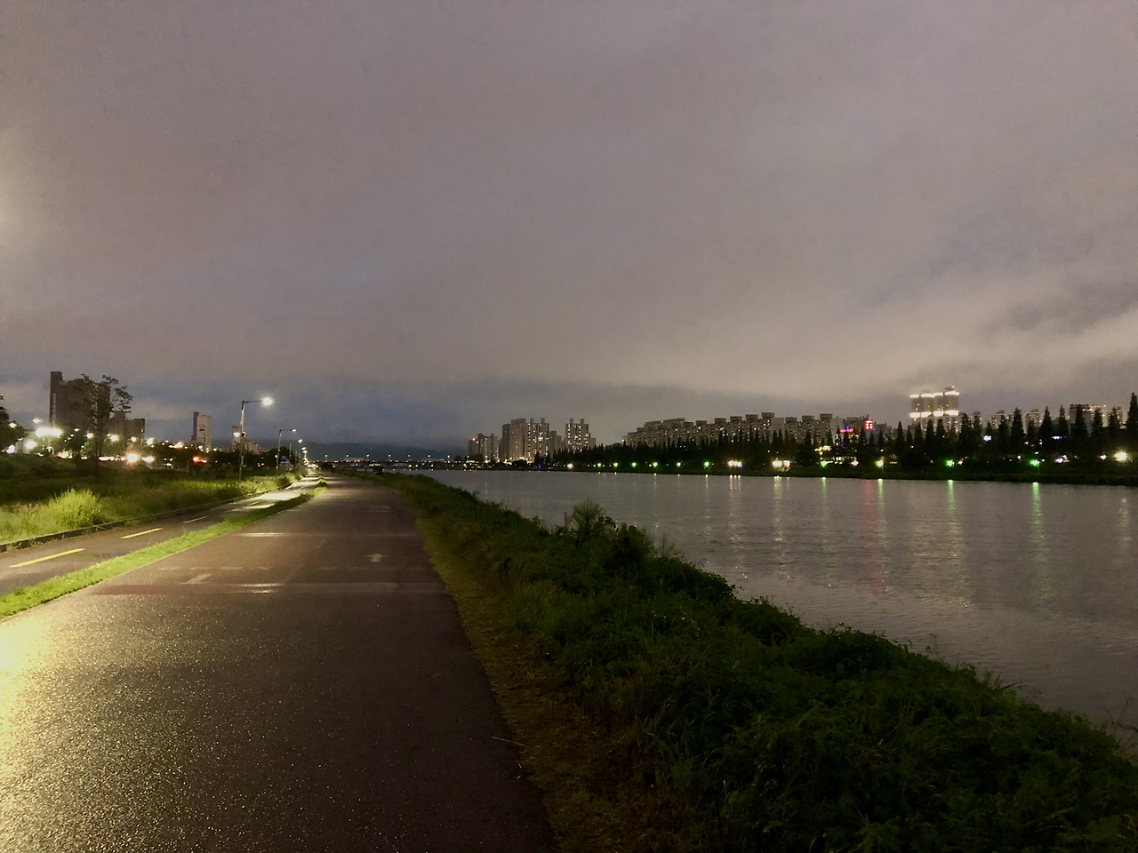 비가 많이 내리면 강변의 조깅 코스에 사람들이 소거된 것처럼 보인다. 비가 와도 조깅 코스에 몇 명은 나와서 슉슉 숨을 뿜어내며 달리거나 자전거를 타는데 지정할 수 없는 비가 내리면 이렇게 사람들이 전부 약속이나 한 듯 나오지 않는 경우가 있다.
