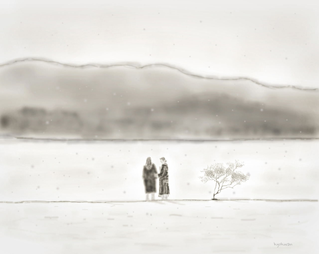 강변 호텔을 본 사람은 알겠지만 김민희와 송선미가 눈밭에 서 있는 장면은 무척 인상적이다. 나는 그 장면이 너무 좋아서 그 장면을 따라 그려봤다. 저 멀리 강 건너에는 마을이 있지만 마을의 모습은 어려워서 그리지 못했다.