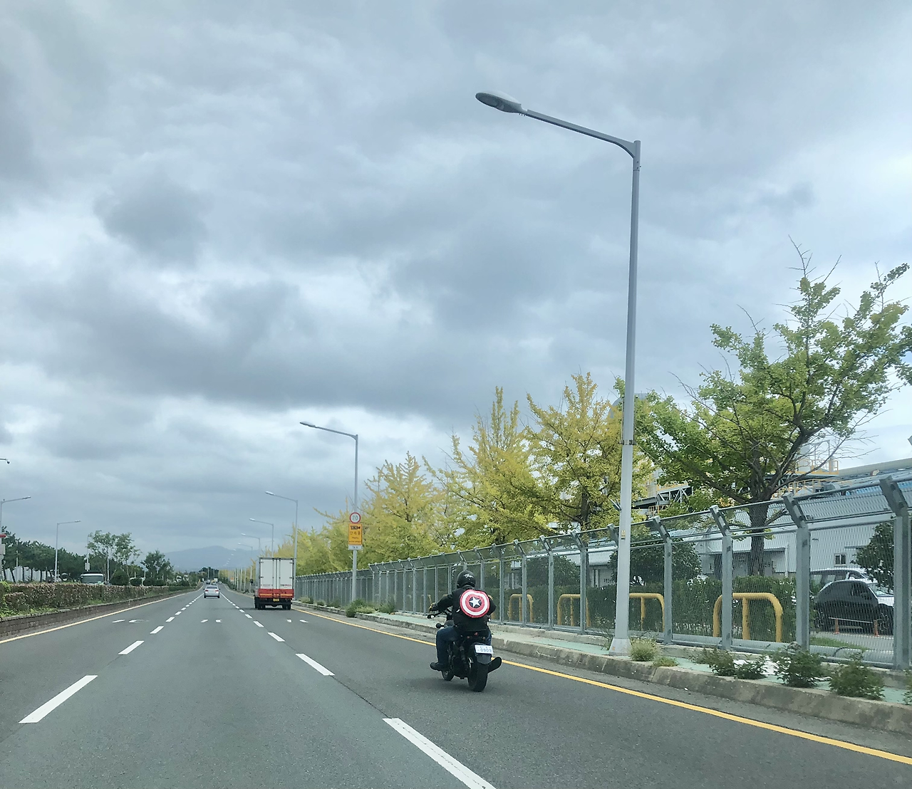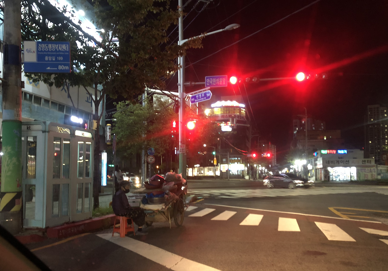 신호대기를 하고 있는데 리어카를 몰고 가던 할머니께서 느닷없이 의자를 꺼내서 도로에 앉았다. 할머니가 앉은 도로는 좌회전을 해야 하는 자동차 도로인데, 저 신호가 초록색이 되면 차들이 좌회전을 해야 하는데 할머니 뒤에 서 있던 차 속의 운전자가 당황을 했다. 어쩌지 못하고 있다가 문을 열고 나오는데 건널목의 신호가 파란색으로 바뀌었다. 그러자 할머니가 의자를 리어카에 올리고 리어카를 밀어서 유유히 건널목을 건넜다. 이야 이 분위기가 정말 재미있는 장면이었다.