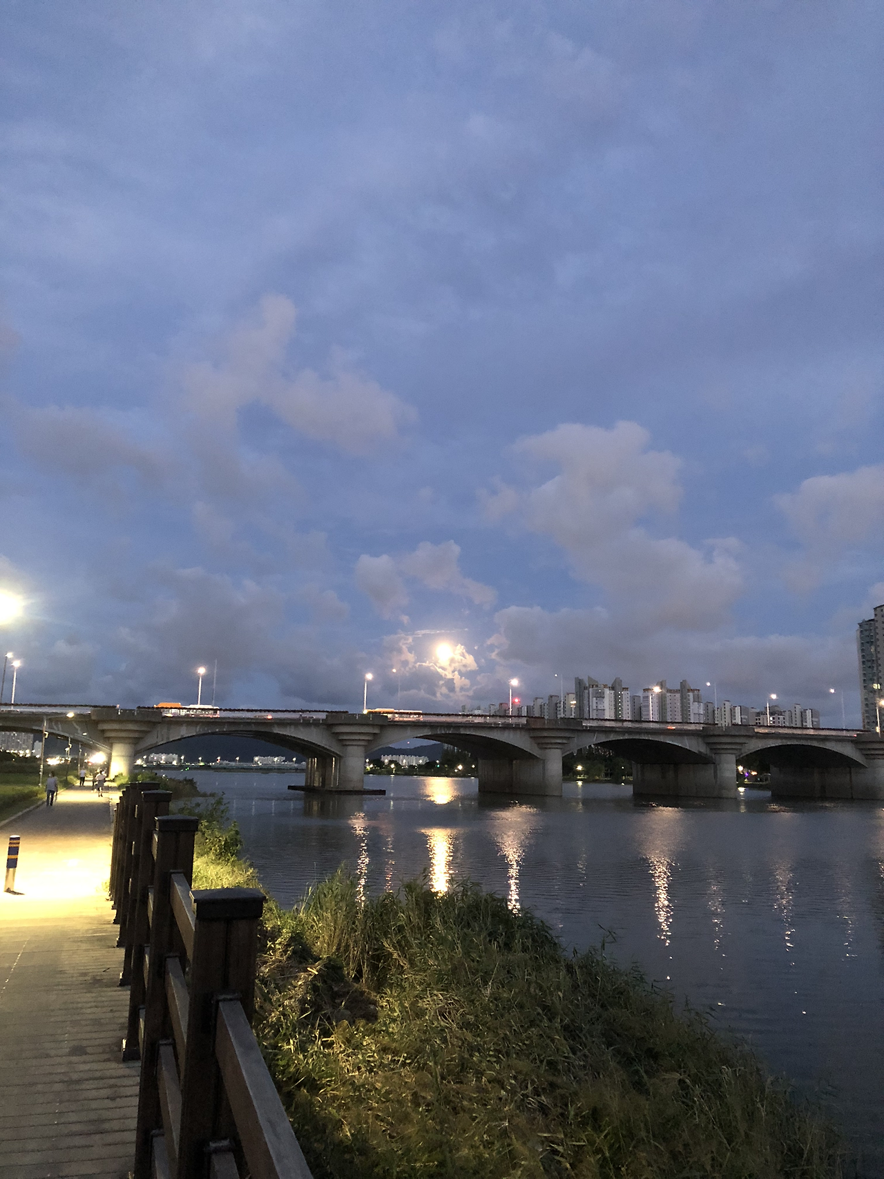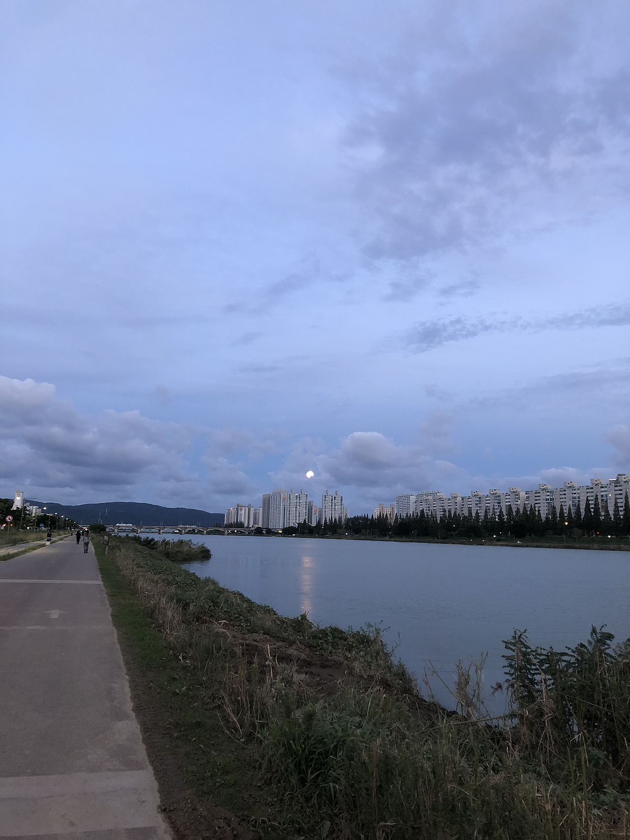 추석이 다가오면서 보름달이 뜨기 시작했다. 아직도 강가는 태풍으로 불어난 물 때문에 축축하고 냄새가 미미하게 났다. 조깅하기에 아주 좋은 저녁, 산책하기에 더없이 괜찮은 저녁이다. 좋지 않은 나의 폰카메라로 이렇게 보름달을 담을 정도면 아주 괜찮은 폰카메라로 사진을 담으면 크고, 멋진 왕의 얼굴을 닮은 보름달을 담을지도 모른다.