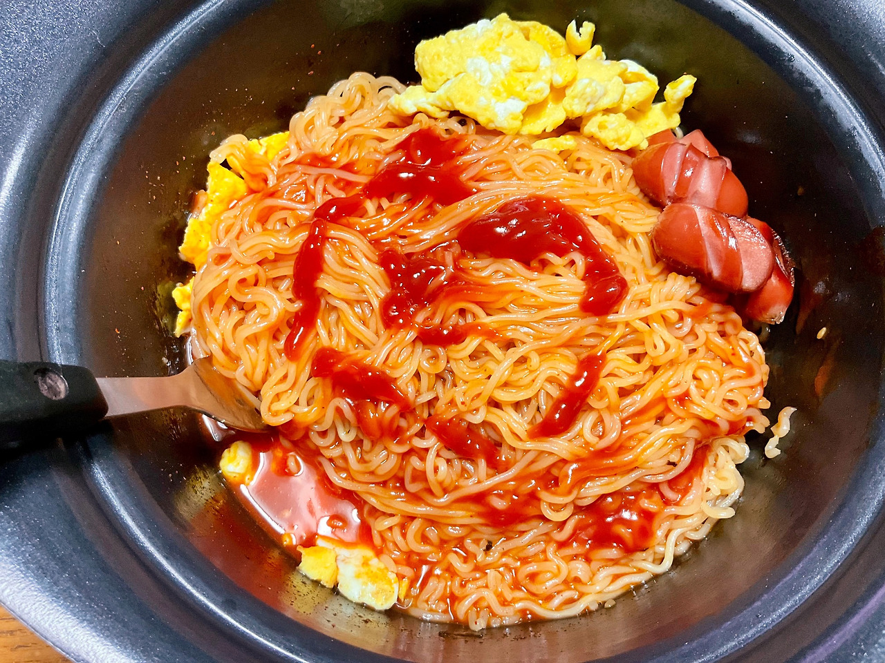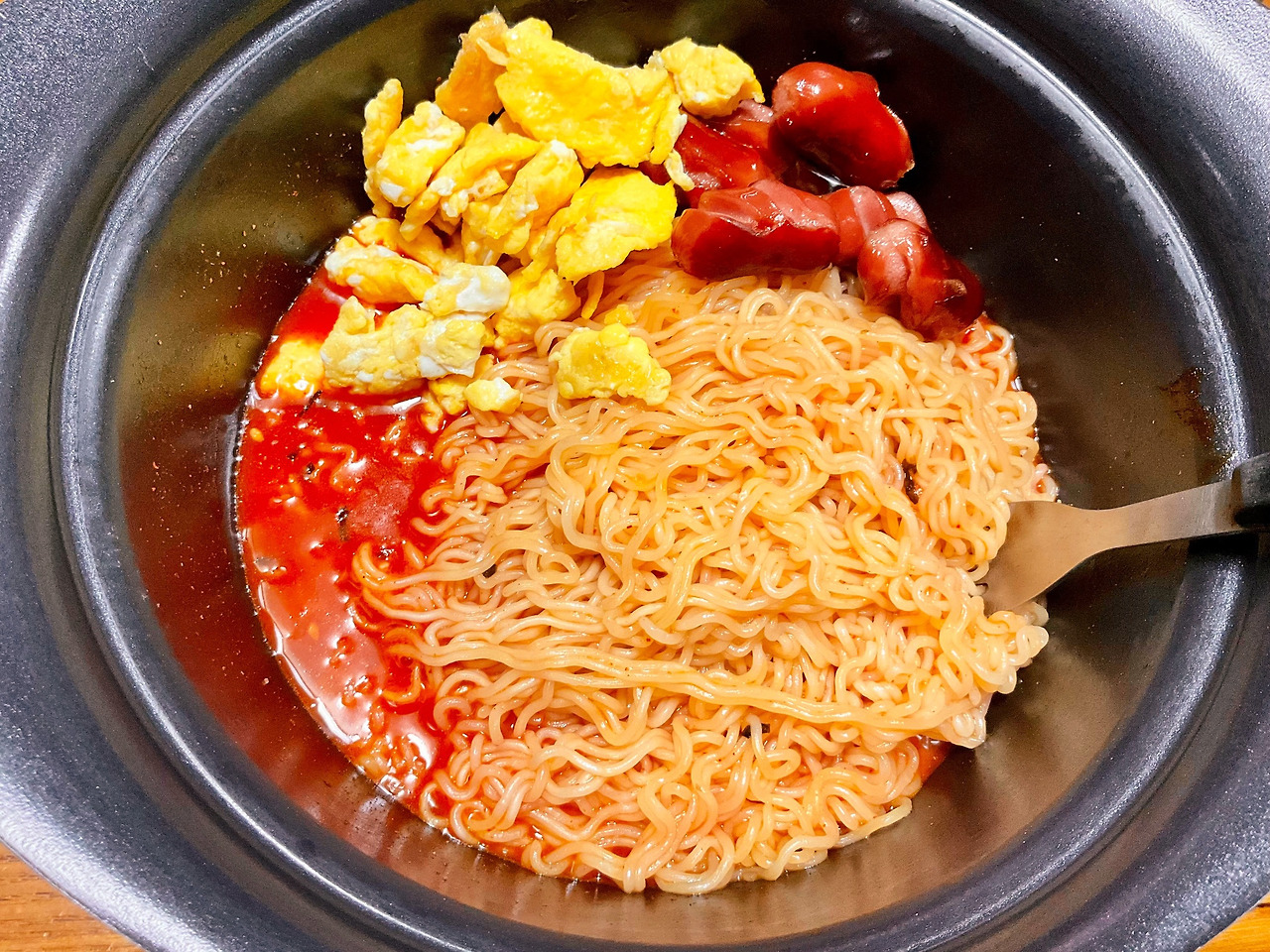 먼저 팔팔 잘 끓인 다음에, 짜파게티처럼 물을 다 버리지 않고 그대로 양념장을 짜 넣어서 다시 팔팔 끓여 졸인다. 그때 치즈를 한 장 넣어서 휘휘 비빈다. 그다음에 케첩을 양 껏 뿌린 다음에 마지막으로 토핑을 해서 먹으면 아주 맛있는 토마토 스파게티의 맛이 난다. 면 자체가 맛있어서 스파게티 면보다 더 졸깃하고 맛있는 것 같다.