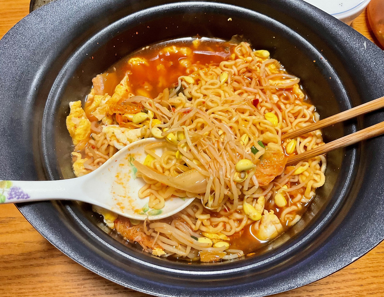 오밤중에, 자정에 이게 무슨 짓이지,라고 하면서 끓이지만 일단 한 젓가락 하게 되면 모든 생각은 액토플라즘이 되어 공중으로 떠 올라 허공으로 사라진다.