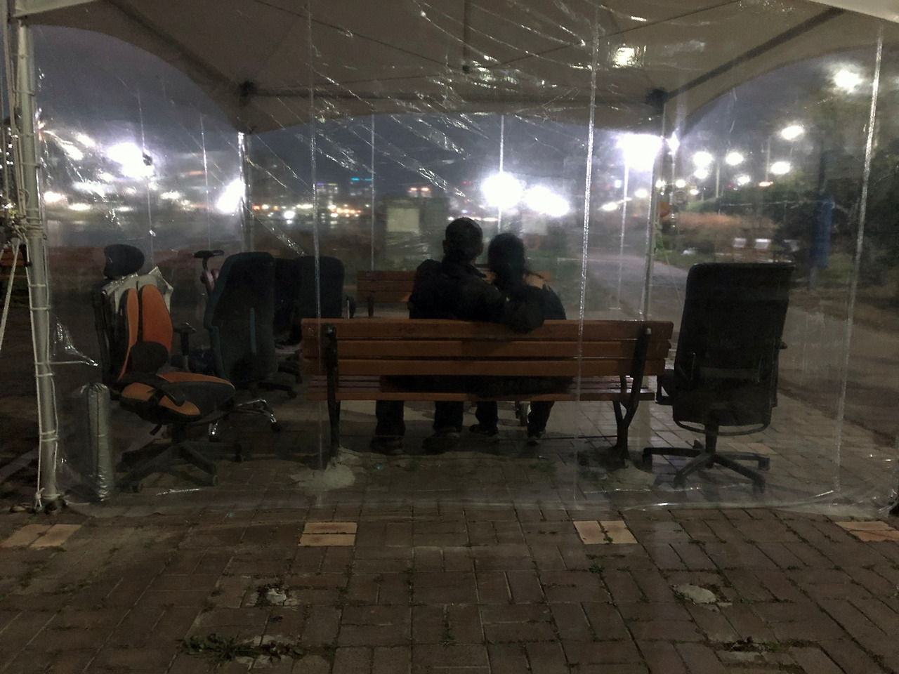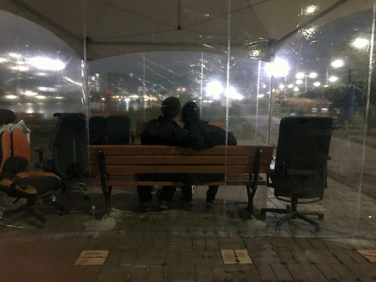가을로 접어들면서 산스장 벤치에 바람막이를 쳐놨다. 그곳으로 노부부가 와서 앉았다. 할머니의 거동이 불편해서 바퀴 달린 휠체어 같은 의자를 천천히 밀어서 걸었고 그 옆에서 할아버지가 할머니가 넘어질세라 할머니를 보호하며 딱 붙어서 왔다. 그렇게 바람막이 안 벤치에 앉기까지 느릿느릿 천천히 겨우겨우 도달해서 앉았다.