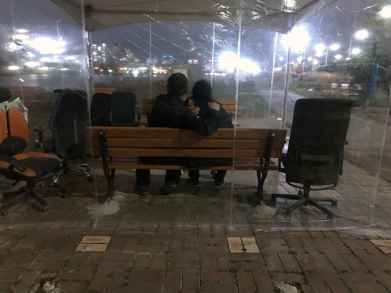할아버지는 할머니가 그만하라고 몇 번이나 말해서 주무르는 걸 관둔다. 할아버지는 할머니의 얼굴에 얼굴을 딱 붙이고 이야기를 했다. 혹시라도 추울까 봐 뺨을 비비기도 했다. 어깨를 주물렀던 할아버지의 오른손은 언제나 할머니를 지키겠노라, 어깨 뒤 벤치에 걸치고 있다. 노년의 뒷모습이 아름답다. 할아버지는 할머니를 살뜰히 아끼고 보호막이 되어 주었다. 할머니의 몸은 불편해 보였지만 얼굴은 행복해 보였다.