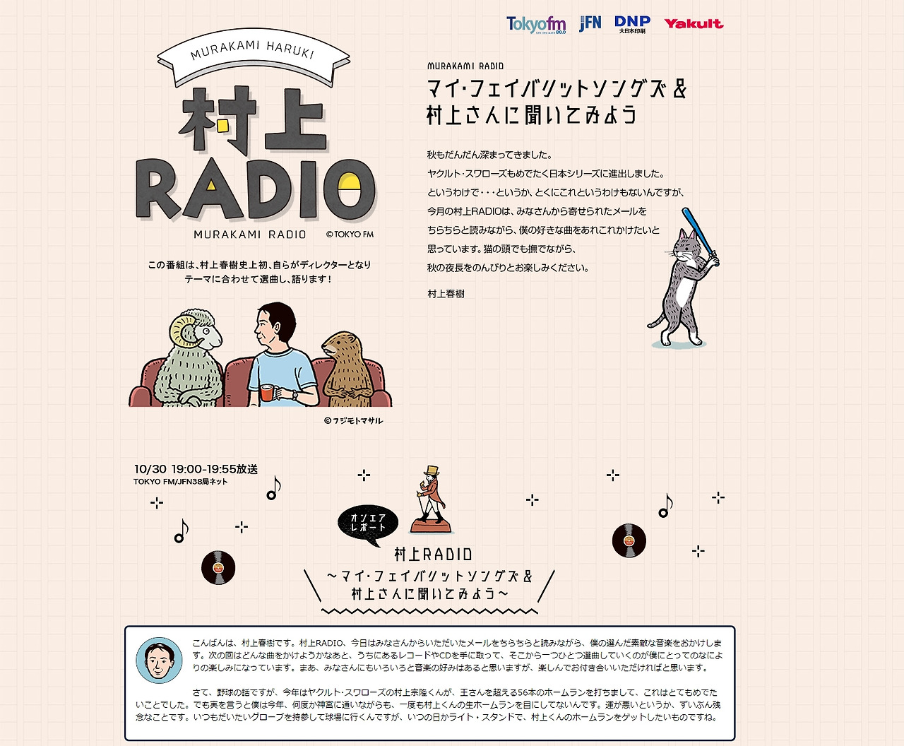 도쿄 에프엠 홈페이지에 올라오는 일러스트도 매 회에 맞게 올라와서 보는 재미가 좋습니다. 43회에 네코야마상이 야구방망이를 들고 있는 일러가 보이죠. 야구광으로 알려진 하루키가 43회 방송 초반에 야쿠르트 스왈로즈에서 뛰고 있는 무라카미 무네타카 선수에 대해서 이야기를 합니다.