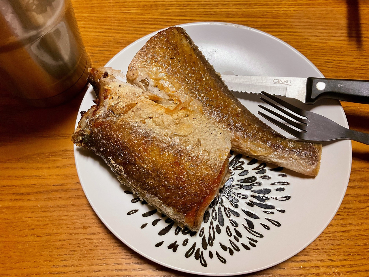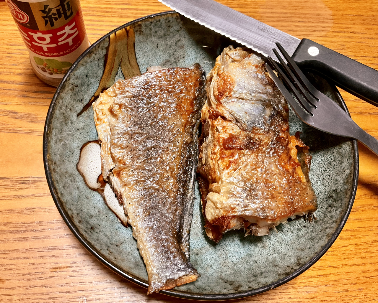 나는 이 순 후추를 늘 가방에 넣어서 다니고 있다. 그래서 집 밖에서 음식을 먹을 때 – 컵라면을 먹을 때에도, 후추가 없는 식당에서 음식을 먹을 때에도 후추를 솔솔 뿌려서 먹기도 한다. 이렇게 노릇노릇하게 생선을 잘 구워 잘라먹을 때 후추를 솔솔 뿌려 먹는 맛이 있다. 약간 껍질이 있는 생선을 구워서 먹을 때 맛있는 것 같다.