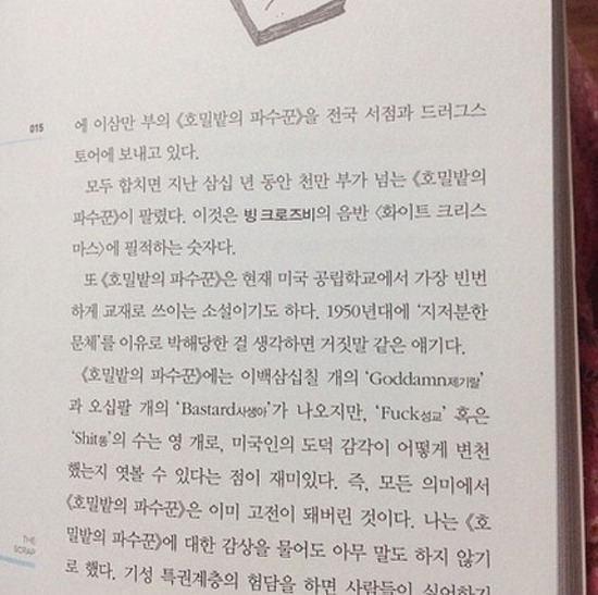 하루키의 이 에세이의 이 부분은(밑의 사진) 영어의 번역이나 해석에 관해서 말하고 있다. 책에도 나오지만 소설 속에는 270개의 ‘제기랄’과 58개의 ‘사생아’가 나오지만 ‘성교’나 ‘똥’은 0개로 나와있다고 하는데, 에세이에서도 말하지만 샐린저의 이 소설은 50년대에 가장 ‘지저분한 문체’를 이유로 박해당한 걸 보면 순 개 뻥 같은 이야기다.