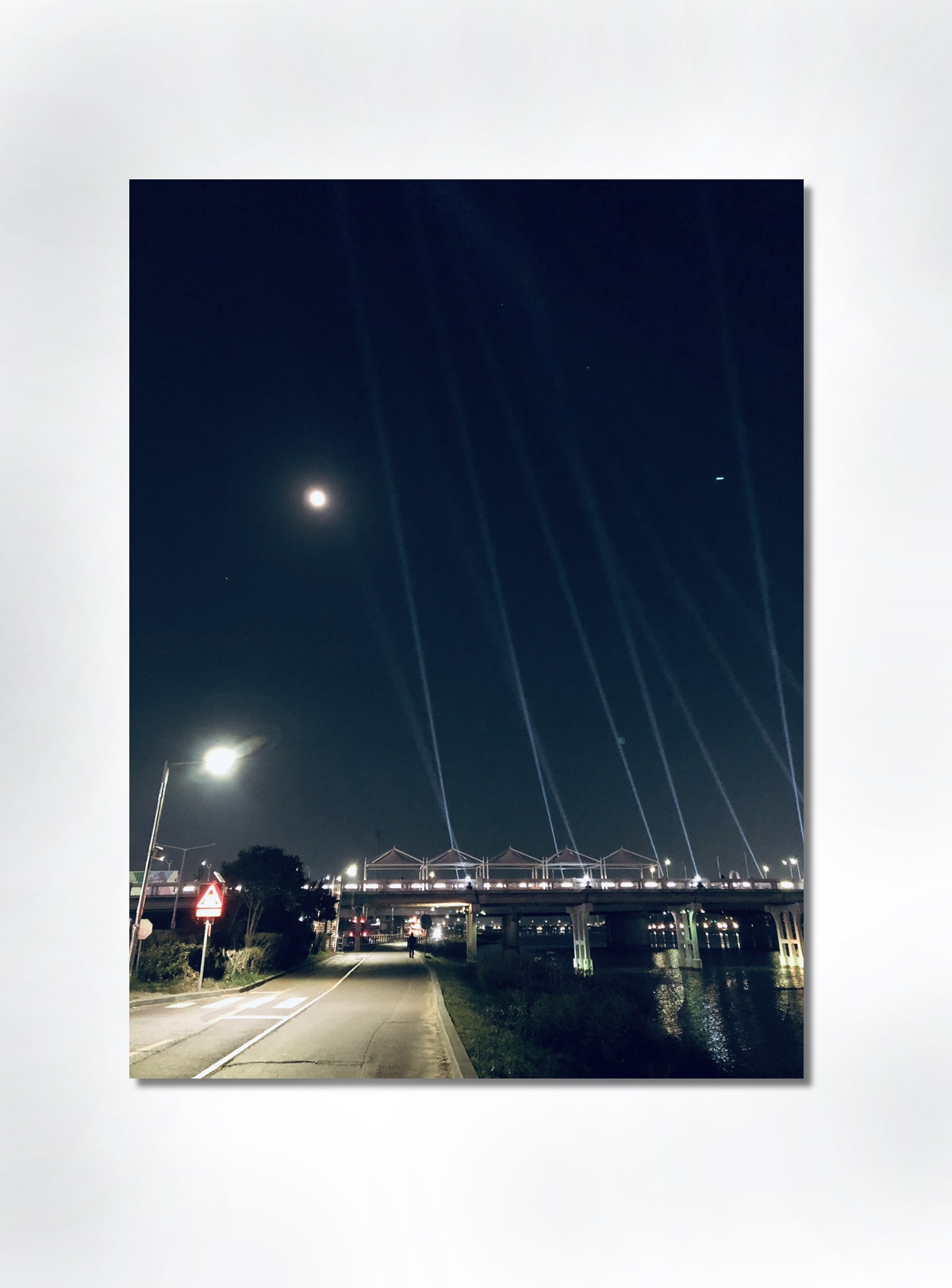 어느 날부터 조깅을 하는 나를 응원하려는 조명쇼가 펼쳐지고 있다. 한 조명이 달에 가서 닿았다. 달은 흥 하며 인공조명에 질 수가 있나. 나는 몇십억 년 동안 여기에서 매일 밤 너희 인간들을 위해 밤을 밝혀줬는데.