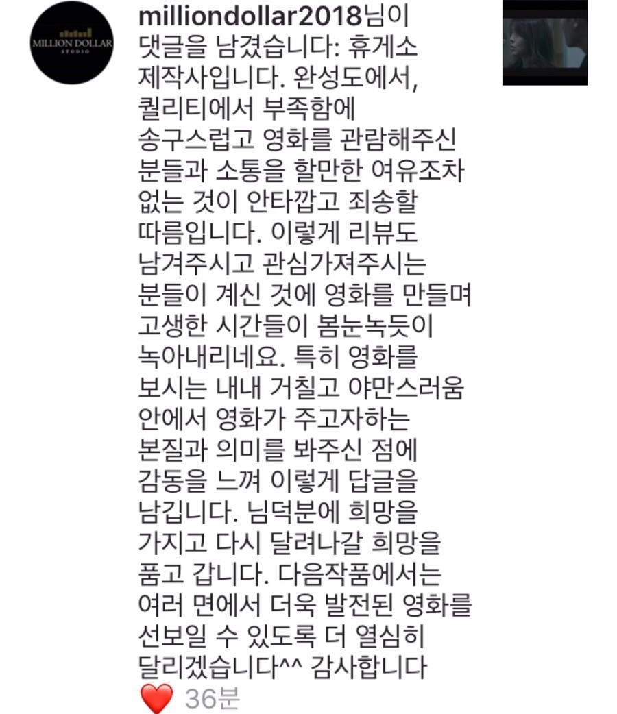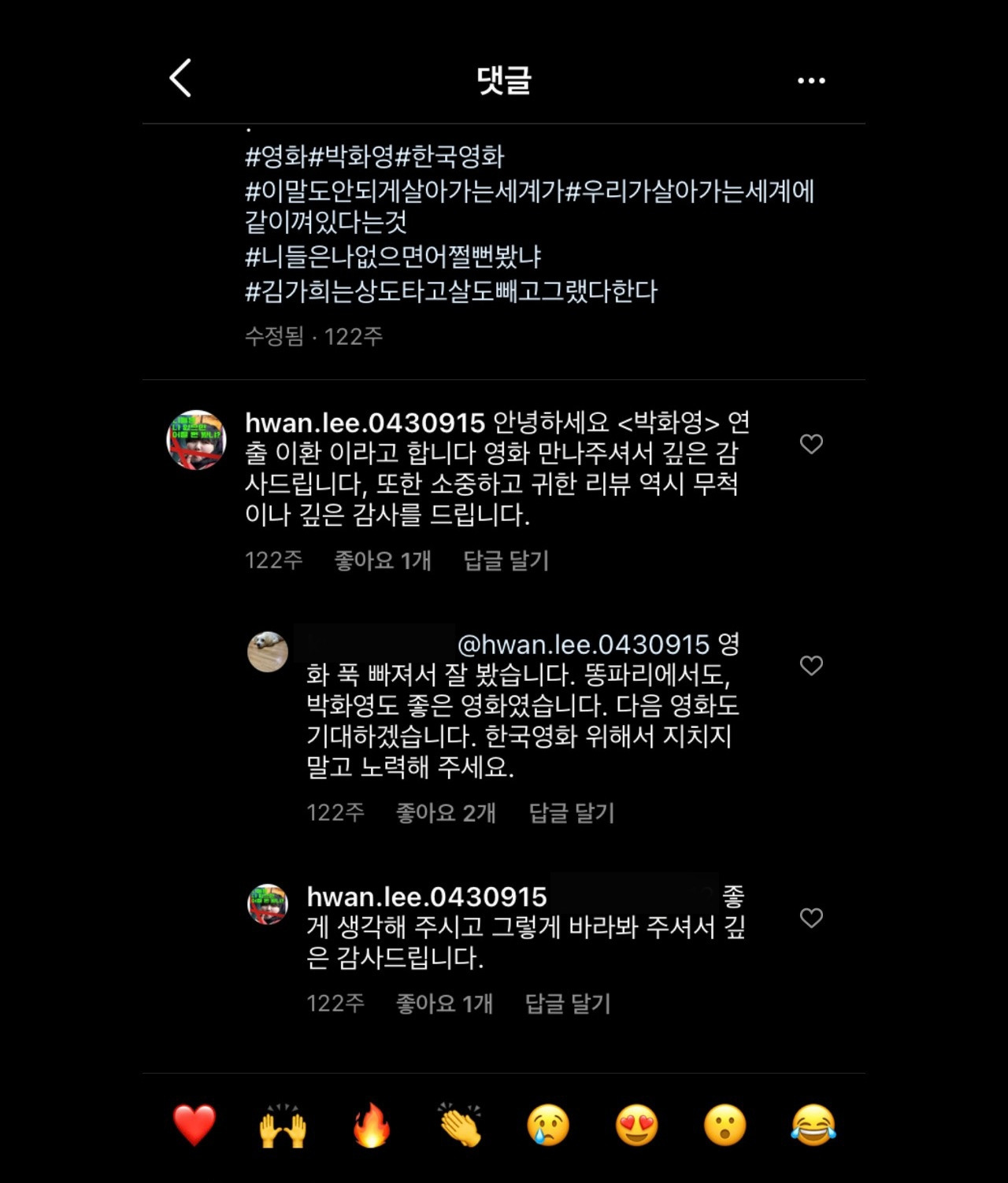 긴 글을 인스타그램에 올려 사람들이 전혀 안 볼 것 같다고 하지만 영화에 대한 이야기만 올리는 인스타그램 덕분에 아직 무명이지만 여러 배우들과도 디엠을 주고받게 되었다.