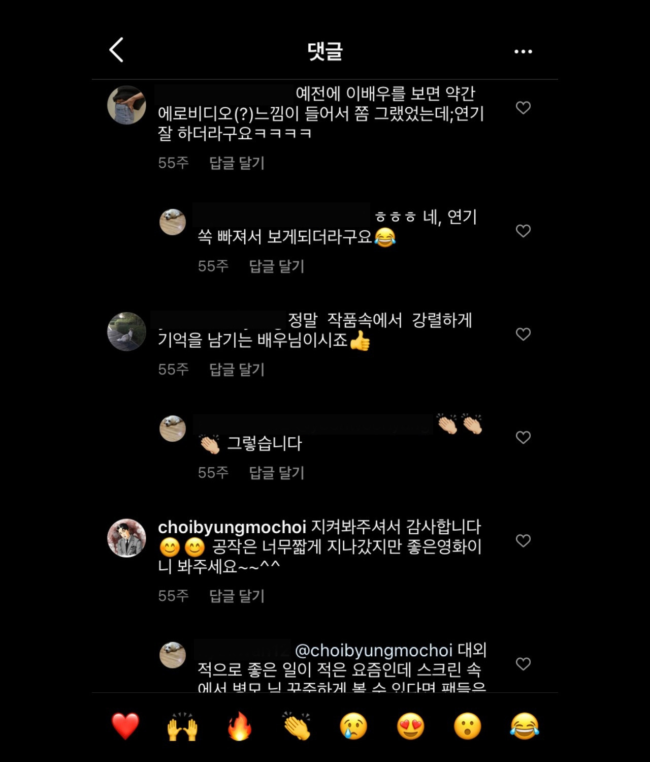 최병모는 부패하고 곰팡이가 핀, 그래서 긁으면 고름이 터져 나오는 인물들을 늘 연기를 했다. 그 사악함과 비굴함, 그리고 결국에는 지질 해지는 한국 사회의 병폐를 그 한 사람이 다 연기를 하는 것만 같았다. 연기를 잘한다고 생각했다. 그랬는데 어느 날은 최병모 배우가 댓글을 달았다. 재미있는 일이다.
