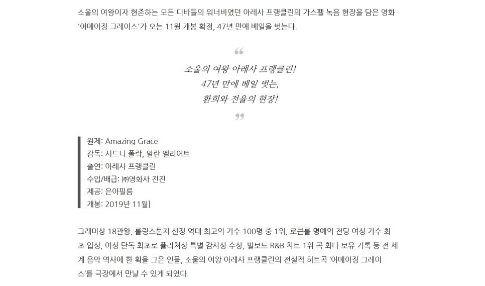 그녀의 영화가 코로나 전에 나왔다. 아레사 플랭클린은 가창력, 터질 듯한 고음으로 유명하지만 고요한 노래가 더 듣기 좋은 가수다. 영화 개봉 전에 유튜브로 예고 동영상이 먼저 나왔는데 영화 제목처럼 ‘어메이징 그레이스‘를 부르는 장면이 나오고 열광하는 젊은 믹 재거의 모습도 보인다. 믹 재거는 이 영화를 두고 신의 얼굴을 보는 것처럼 느껴질 것이라고 했다.