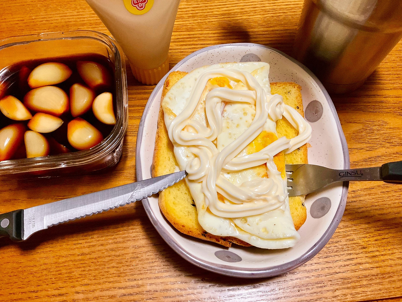 식빵에 계란 프라이를 올렸다. 그리고 마요를 뿌렸다. 아 정말 맛있다. 몸에 미안해서인지 옆에 마늘장아찌를 두었다. 기묘한 것은 고소한 계란 프라이에 마요가 뿌려지면 느끼할 것만 같은데 고소함이 두 배가 된다. 그래서 정말 맛있다.
