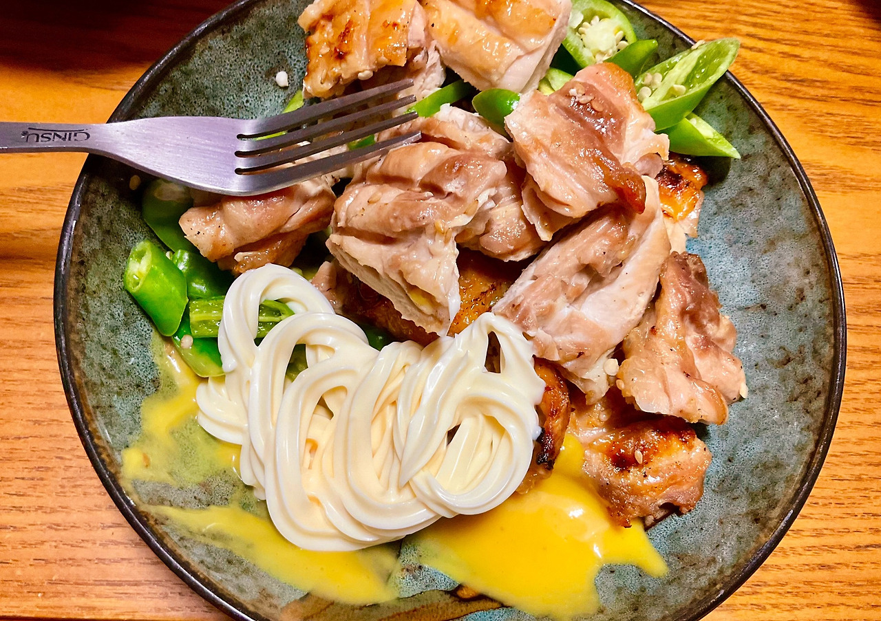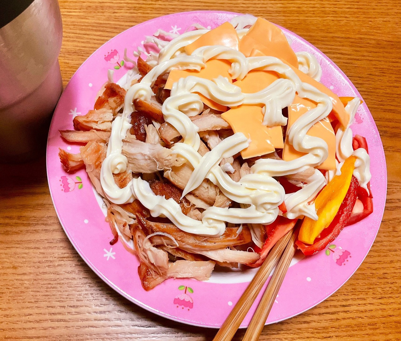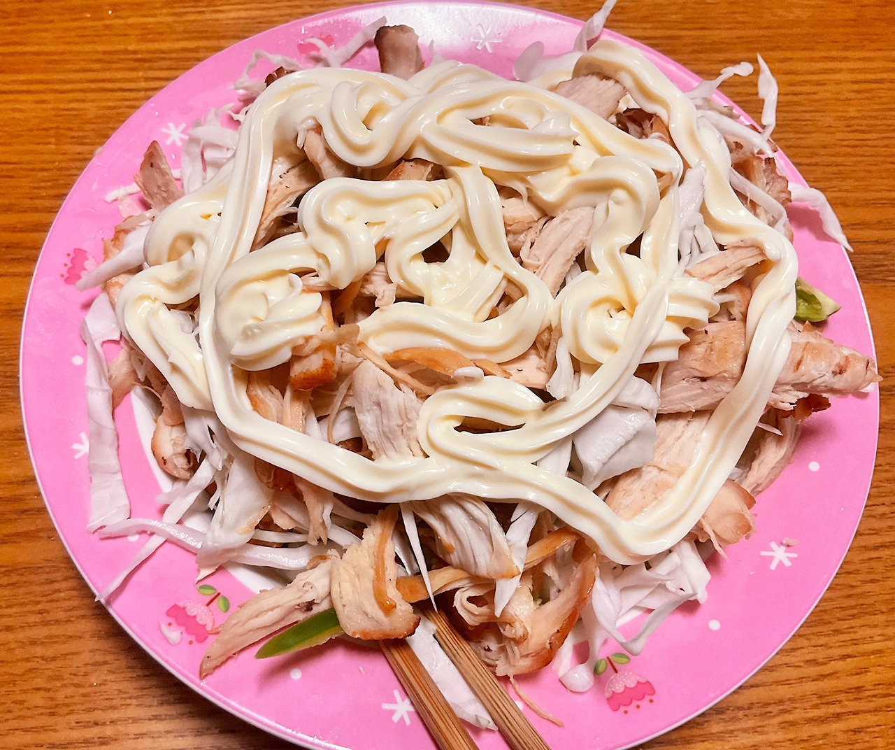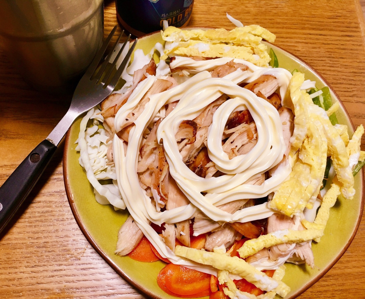 닭 가슴살이 많아서 하루는 이렇게 먹고 하루는 저렇게 먹지만 중요 포인트는 역시 마요다. 닭 가슴살에 계란지단을 같이 올려 먹는 용감함과 하루는 치즈를 넣어서 먹는 무모함도 마요와 먹게 되면 잡고 있던 생활의 정신 줄을 놓게 된다.