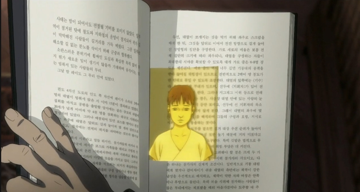 공각기동대 1이 쿠사나기 소령의 이야기라면 2는 소령의 파트너였던 버트의 이야기다. 이 장면은 공각기동대 2편에 속하는 이노센스 편이다. 사진은 영화 속에서 펼친 책의 모습이다. 한글이라 나는 캡처를 해서 또 다 읽어봤다. 얽어보니 여긴 누구? 나는 어디? 같은 내용이다. 1편의 주인공 쿠사나기가 실종이 되었는데 그 기억만 가지고 있는 파트너였던 버트 버전의 이야기다.