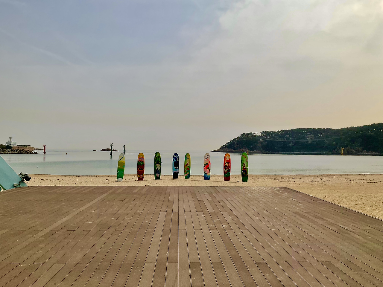 서핑보드의 색깔도 알록달록하지만 멍게 색감이 눈에 띈다. 이렇게 죽 산책을 하며 30분 정도 걸어가면 포구가 나온다. 그동안은 신경을 쓰지 않아서 그랬는지 모르겠지만 바닷가에 인접한 도로에 야자수가 심어져 있었다. 손에 든 것이 많아서 사진으로 담지는 못했는데 예전부터 있었는지 아니면 얼마 전에 심었는지 모를 야자수가 거리를 따라 행렬로 죽 있었다.