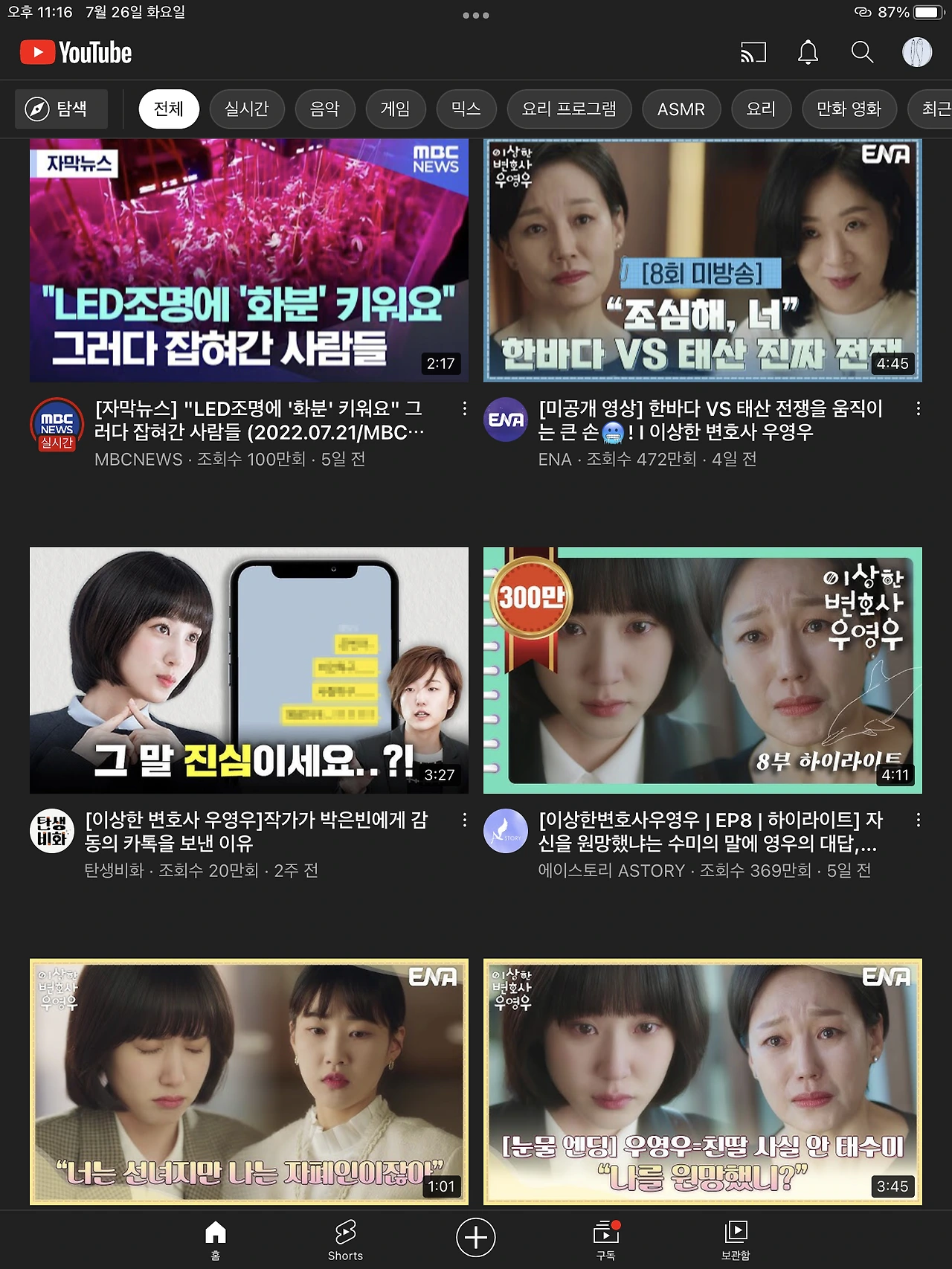 작년 우영우가 한창 유행일 때 유튜브로 우영우 한 번 클릭해서 보고 나면 썸네일이 온통 우영우로 꽉 찼던 적이 있었다. 우영우는 재미있게 봤고 좋은 드라마였다. 그때 캡처를 해 놓았는데 날짜를 보니 여름이다. 마찬가지로 근래에는 더 글로리가 그 바통을 이어받아서 유튜브는 문동은 복수극의 향연이다. 일단 글로리 영상이 올라오면 사람들이 몰려든다. 조회수 올리기에 아주 좋은 먹거리다. 그래서 우영우처럼 글로리 영상이 쏟아졌다.