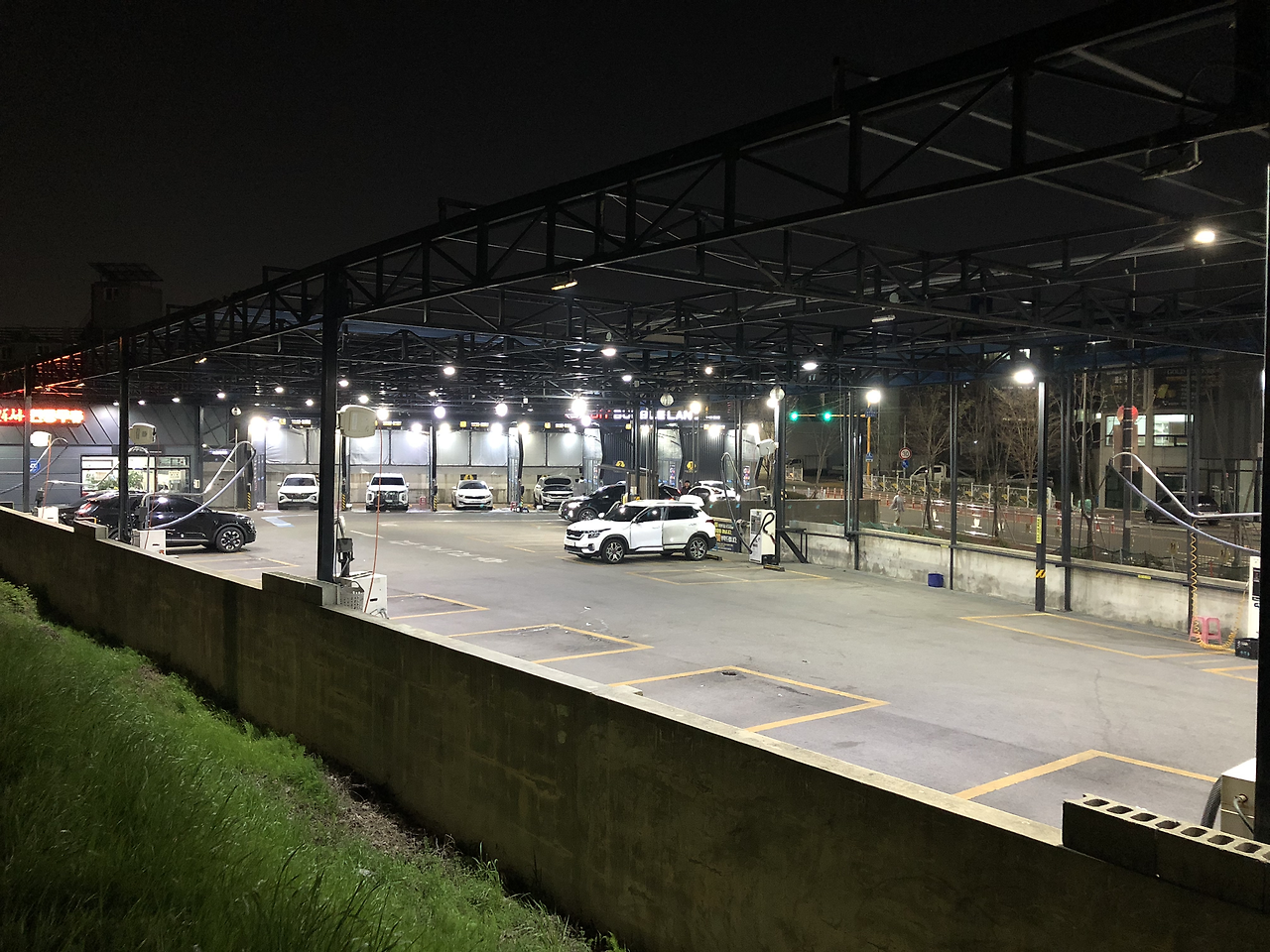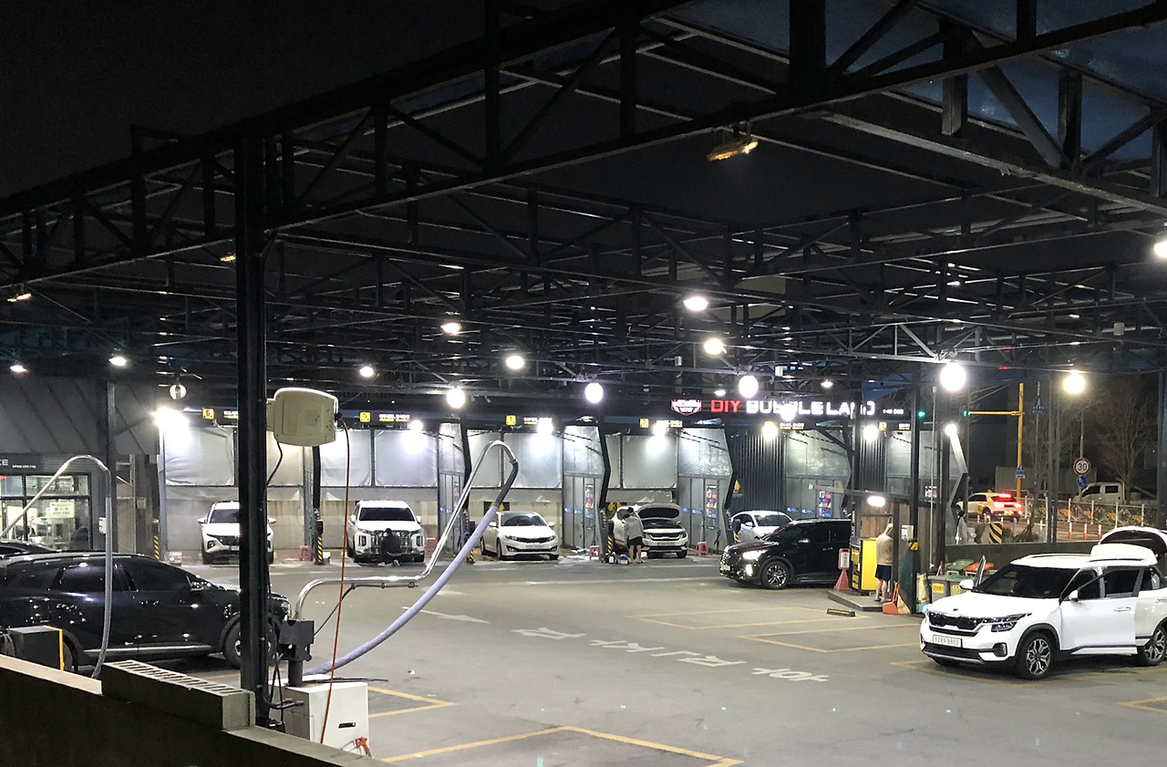 사진으로 보면 저기 저 글자 밑의 검은 차가 들어오는 곳이 입구다. 정면으로 보이는 곳이 물세차를 하는 곳이고, 안쪽으로 들어오면 이렇게 손세차를 하는 공간이다. 그런데 너무 기묘한 광경을 보게 되었는데, 저기 검은 승용차가 세차를 하러 들어와서 대기를 타고 있는 모습이다. 대부분 물세차를 하고 그다음 손세차를 하니까 물세차하는 곳에 차들이 가득 있으니까 대기를 하는데, 물세차하는 곳을 잘 보면 거품세차나 물세차가 끝났는데도 나오지 않고 그냥 거기서 손세차를 하고 있다.