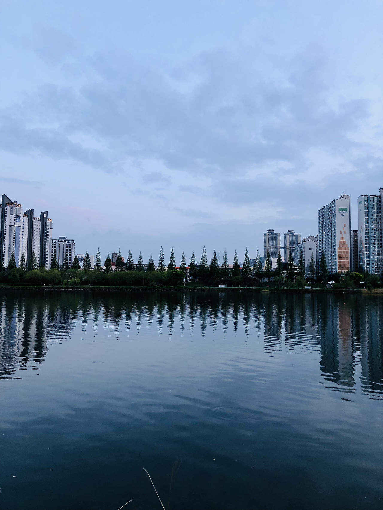 위의 날과 같은 날일까. 강물의 파동이 없고 아주 고요한 날이다. 보통은 낚시꾼들이 나오는데 쌀쌀해서일까, 비가 온 탓일까. 낚시꾼들이 보이지 않았다. 여기서 보는 딱 이 뷰가 좋다. 양 옆으로는 아파트단지가 죽 이어지지만 정면으로는 아파트가 없는. 그래서 양 옆의 아파트 단지를 잘라낸 사진도 괜찮을 것이다.