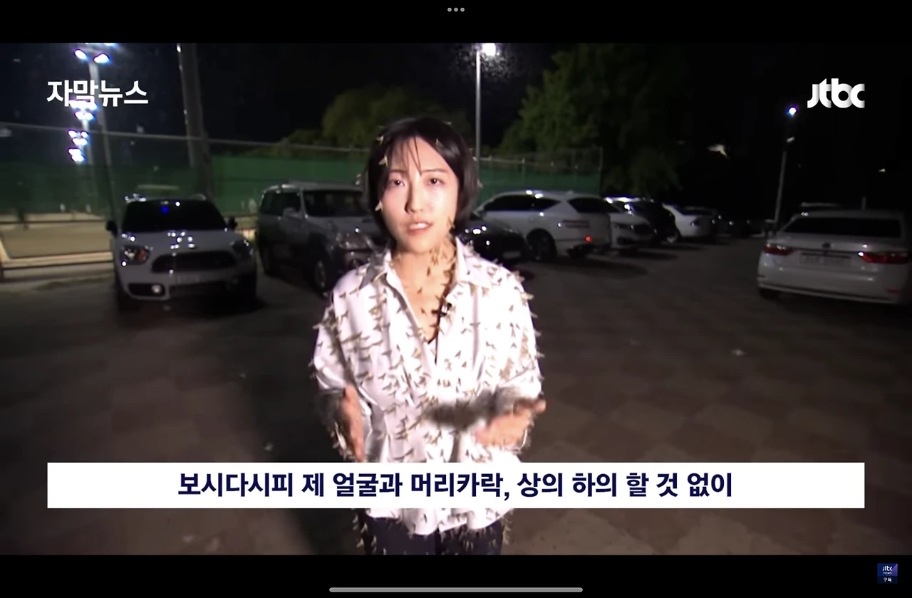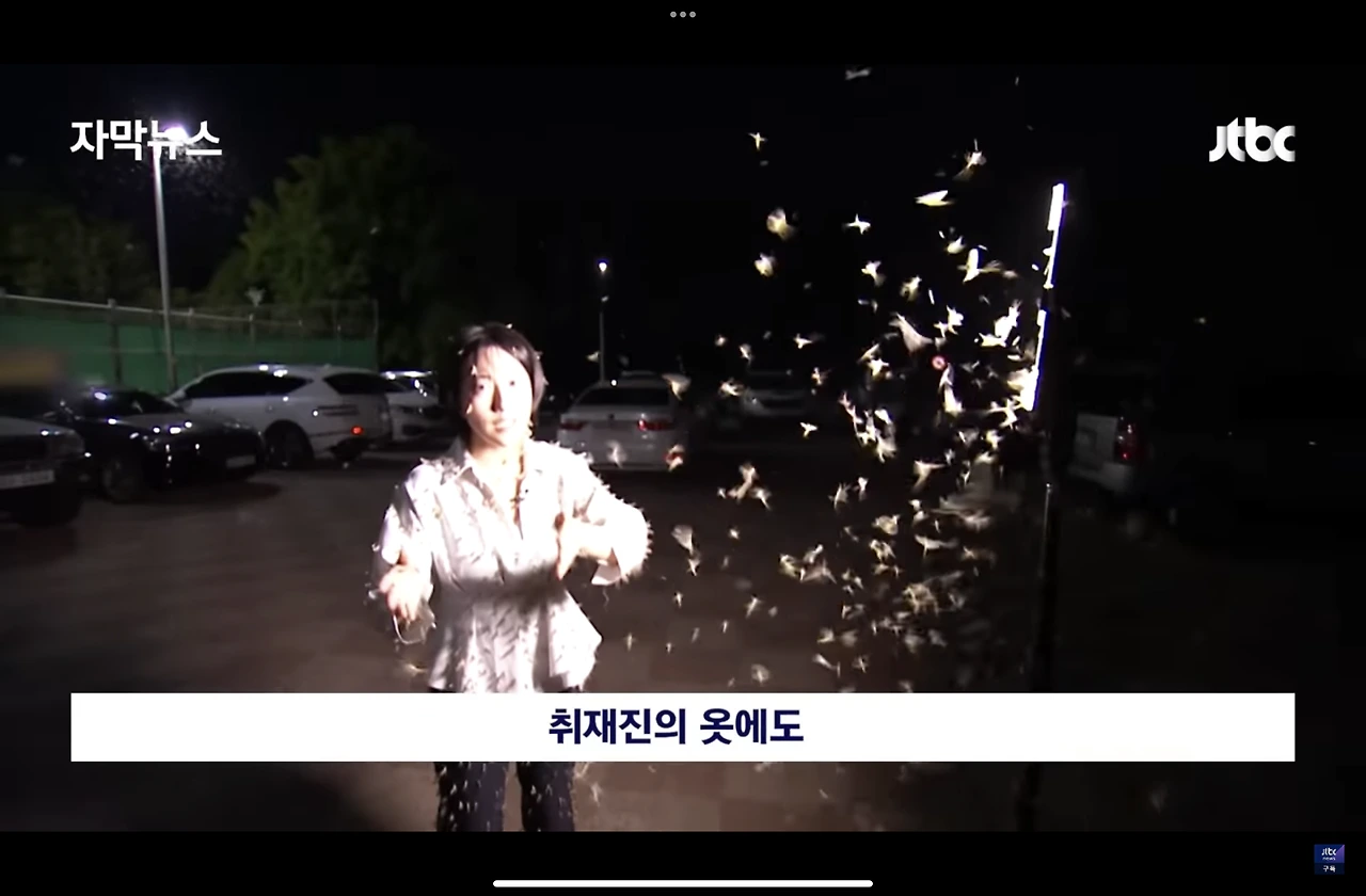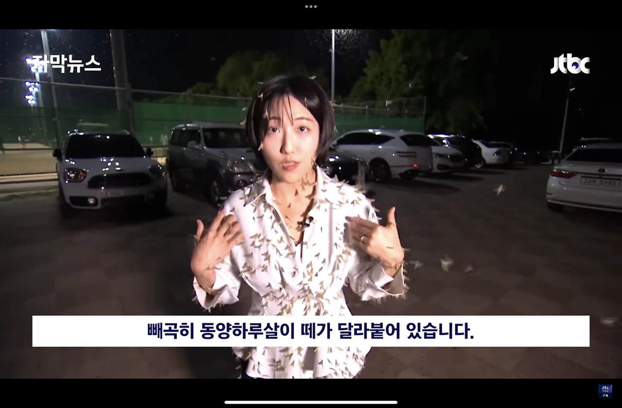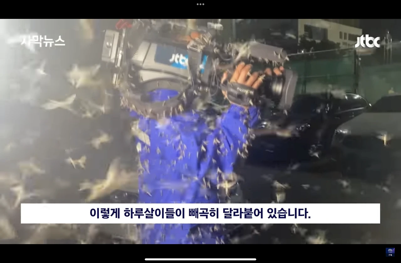 이 사진의 뉴스는 한 일주일 전인데, 5월 28일 자 뉴스에도 동양하루살이 떼에 관한 기사가 있다. 앵커의 첫마디가 ‘도심 곳곳에서 하루살이 떼 습격으로 시민들이 고통을 호소하고 있습니다’였다. https://news.kbs.co.kr/news/view.do?ncd=7686185&ref=A