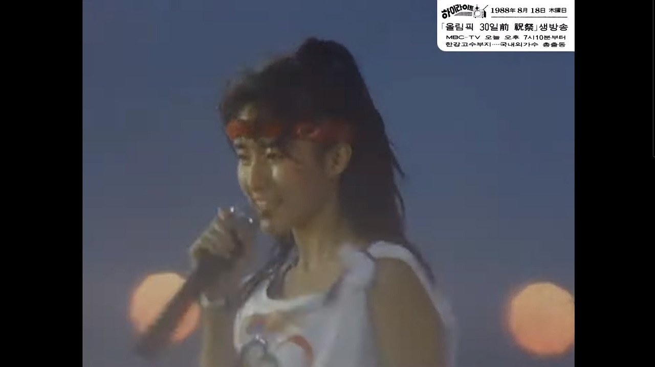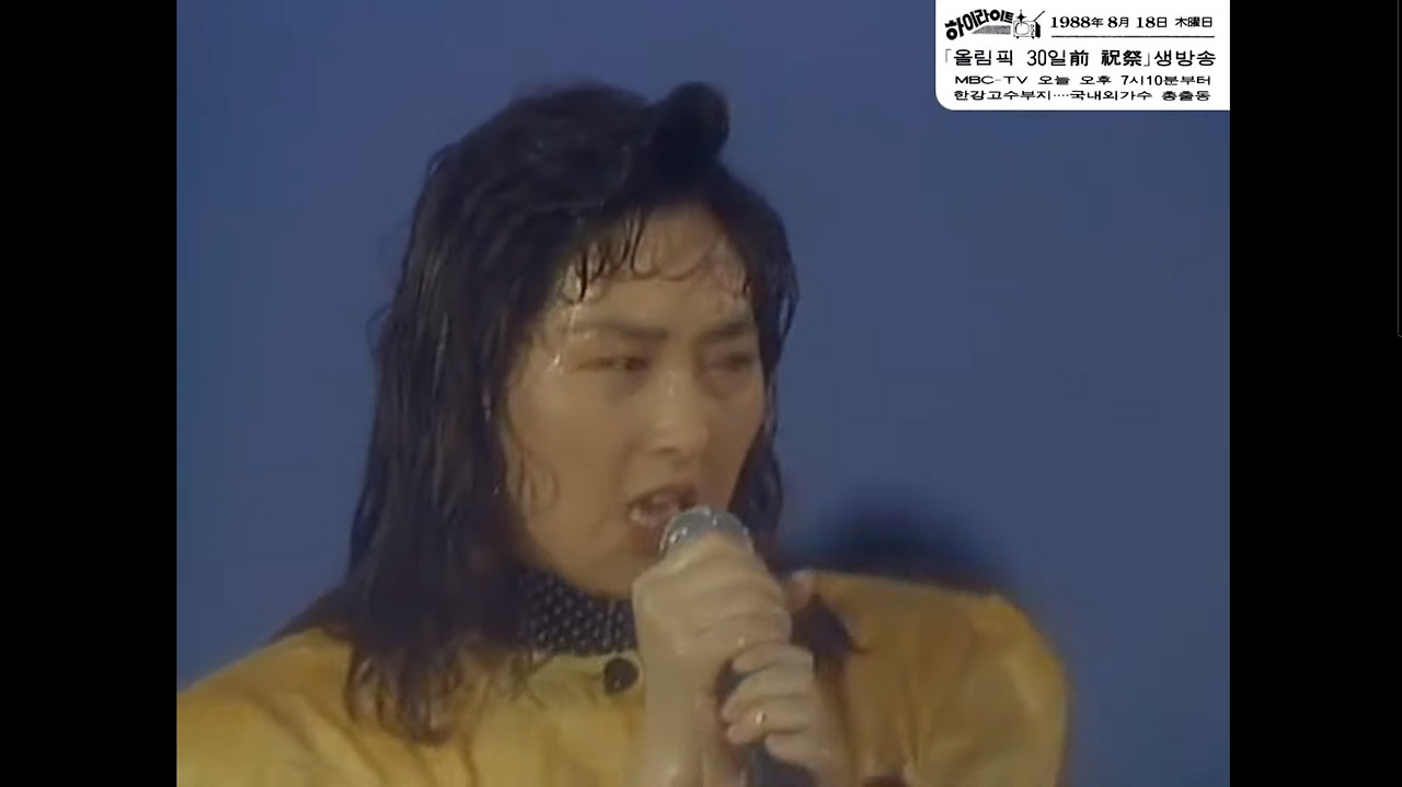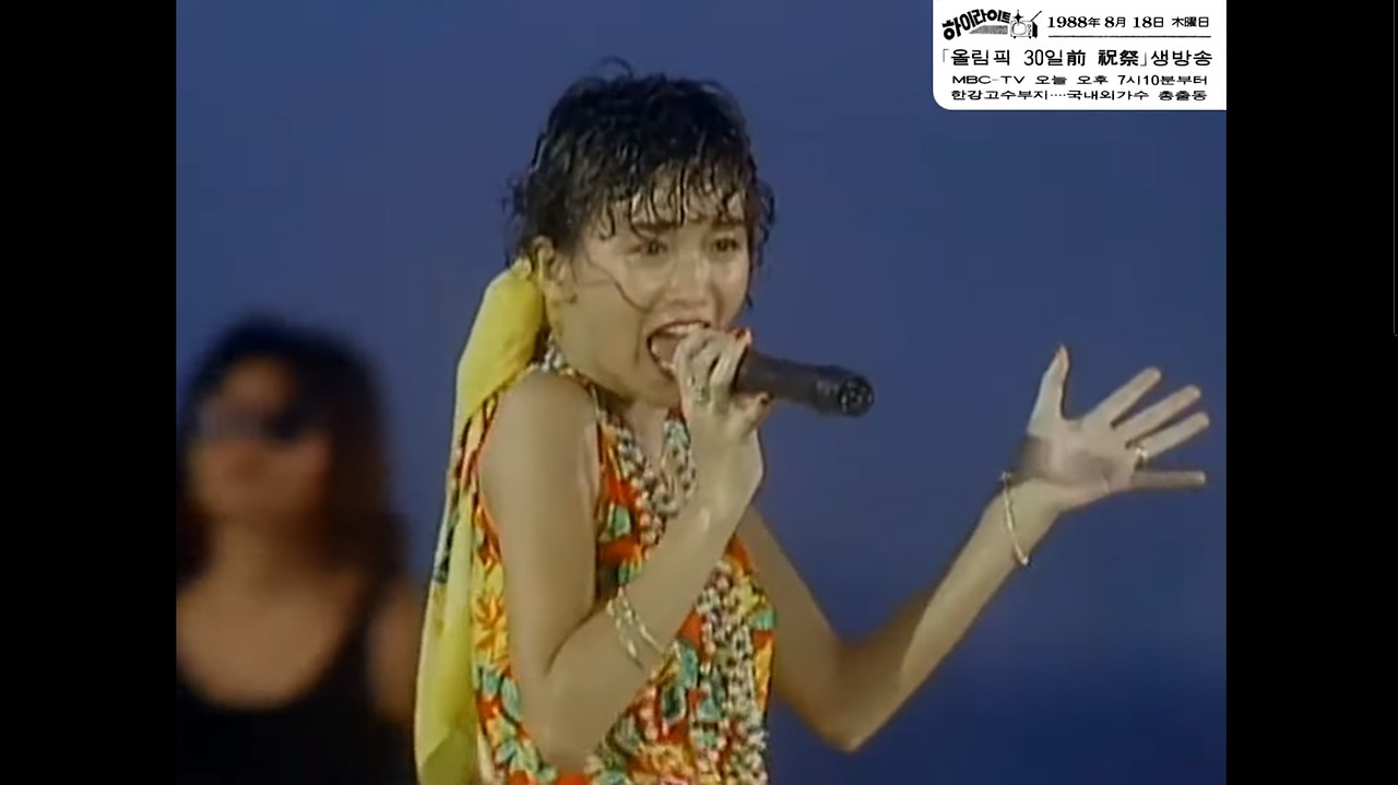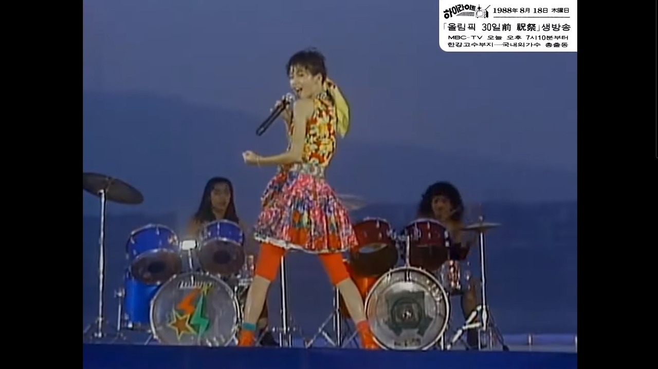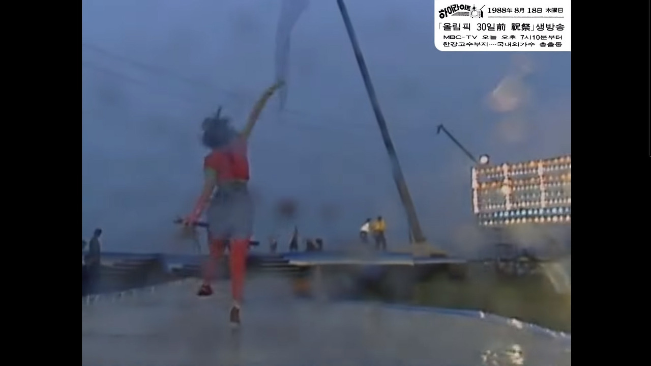 이번에는 지난번 88 서울올림픽 한강 축하 무대 공연에서 정수라, 이지연, 혼다 미나코, 소녀대의 모습이다. 비가 욕이 나올 정도로 엄청났다. 굉장하다. 하지만 한일 그 어떤 가수도 폭우에 굴하지 않고 축제를 즐기는 모습이다.
