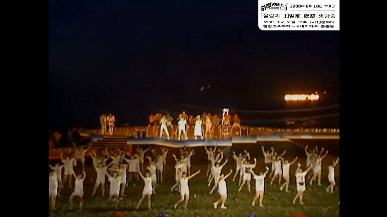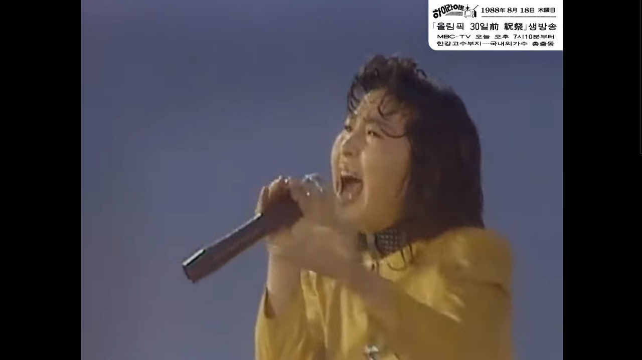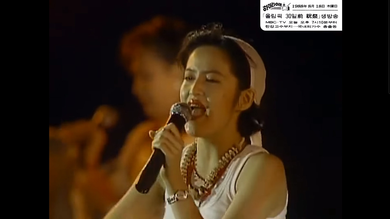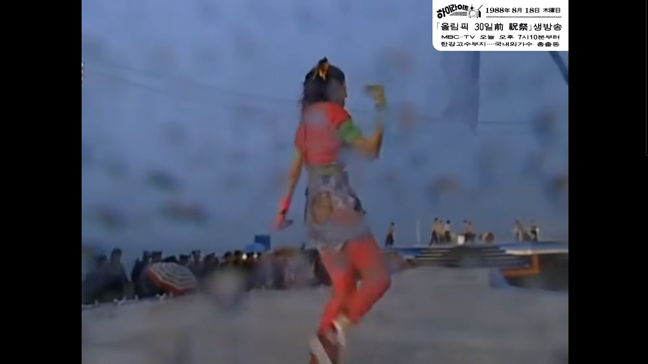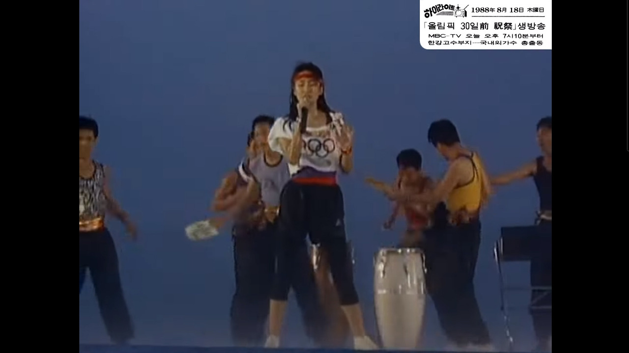 이번에는 지난번 88 서울올림픽 한강 축하 무대 공연에서 정수라, 이지연, 혼다 미나코, 소녀대의 모습이다. 비가 욕이 나올 정도로 엄청났다. 굉장하다. 하지만 한일 그 어떤 가수도 폭우에 굴하지 않고 축제를 즐기는 모습이다.