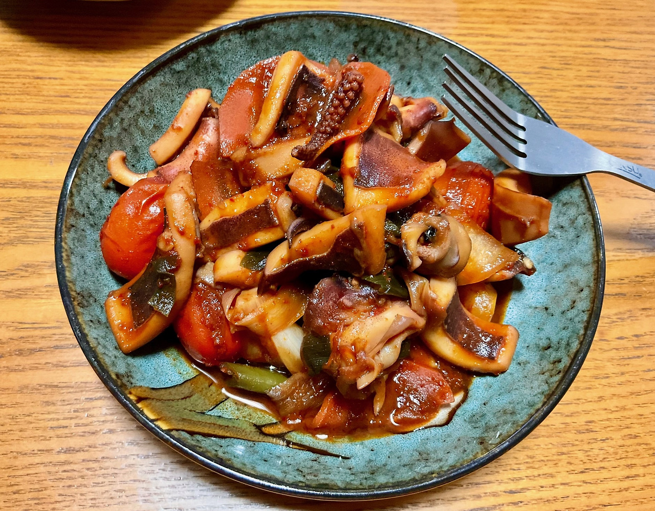 나 같은 맵찔이가 먹기에는 너무나 매콤한 오징어볶음. 그러나 고춧가루가 좋으면 매워도 자꾸 먹게 된다. 여름에는 공포영화의 계절이고 무서운 영화를 볼 때에는 이렇게 매콤한 오징어 볶음이 어울린다고 억지로 우겨본다. 시원한 맥주와 함께 재미있게 무서운 영화를 보는 것이다.