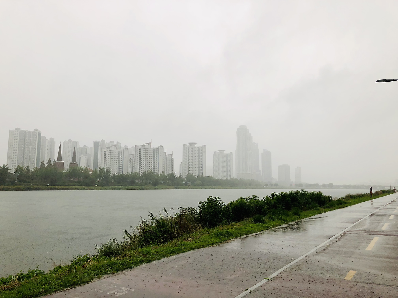 그러나 하루는 비가 너무 왔다. 폭우였다. 사진으로는 그냥 비가 오네 정도로 보이지만 강변 조깅 코스에 그 누구도 나오지 않는, 자동차가 도로를 달리면 마치 물 위를 달리는 것 같은 착각이 들 정도로 거센 비가 내렸다. 우산을 들고 몸을 푸는 곳까지, 대략 500미터 정도 갔는데 홀딱 다 젖어 버렸다.