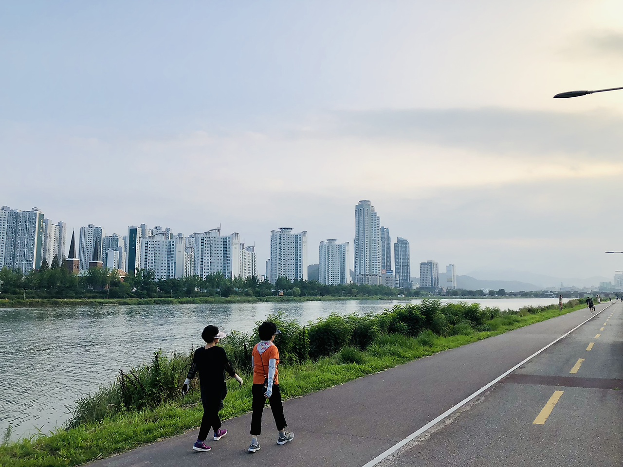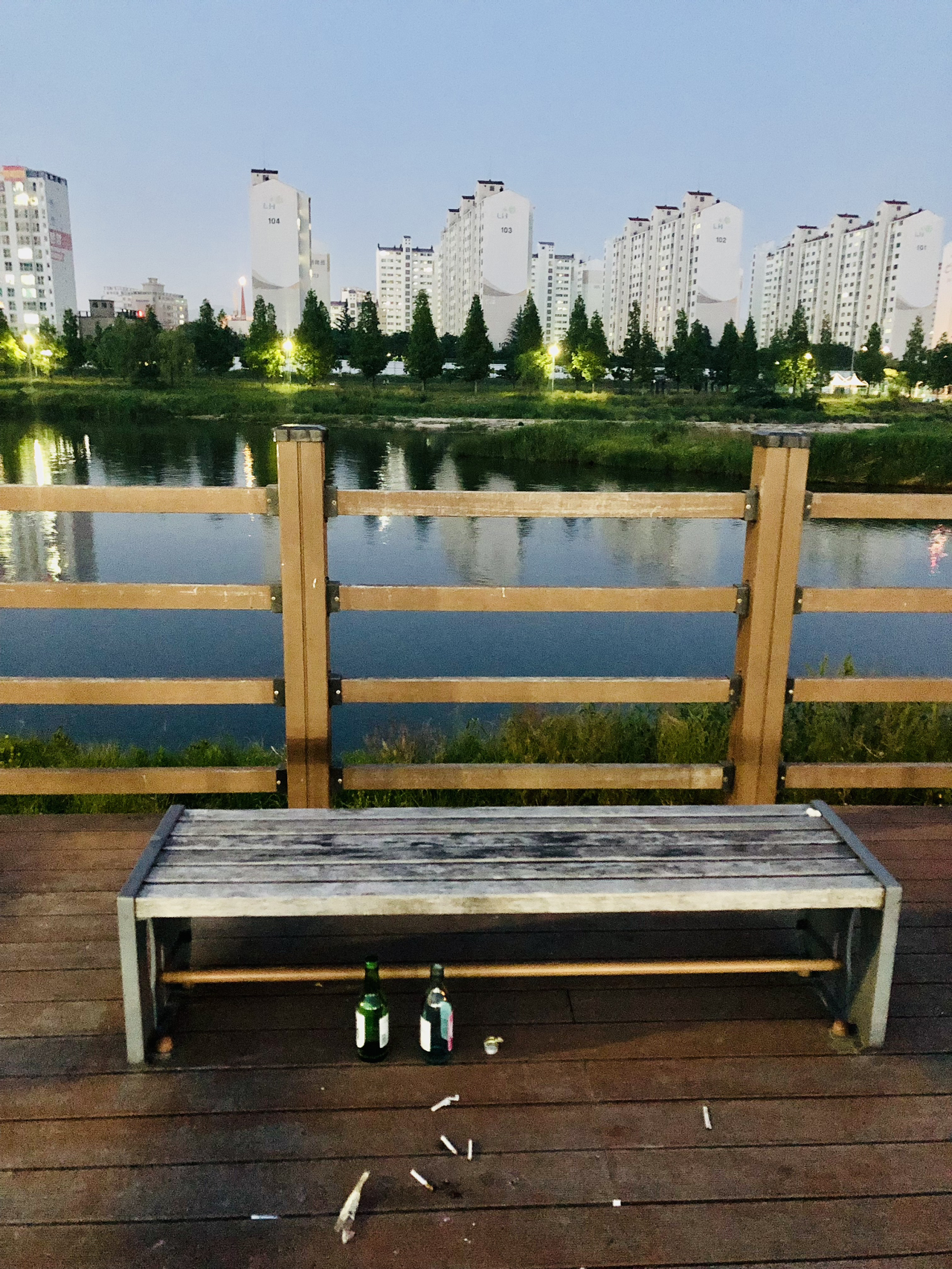 강변으로 조깅을 하는 사람을 제외하고 산책을 하는 사람들은 대부분 어머니, 아버님 같은 나이가 있는 사람들이다. 그래도 할머니, 할아버지에 가까운 사람들은 산책을 하거나 자전거를 탈뿐 이렇게 앉아서 술을 마시지 않는다. 그렇다고 20대나 30대 같은 젊은 사람들도 앉아서 깡소주를 마시지는 않는다.