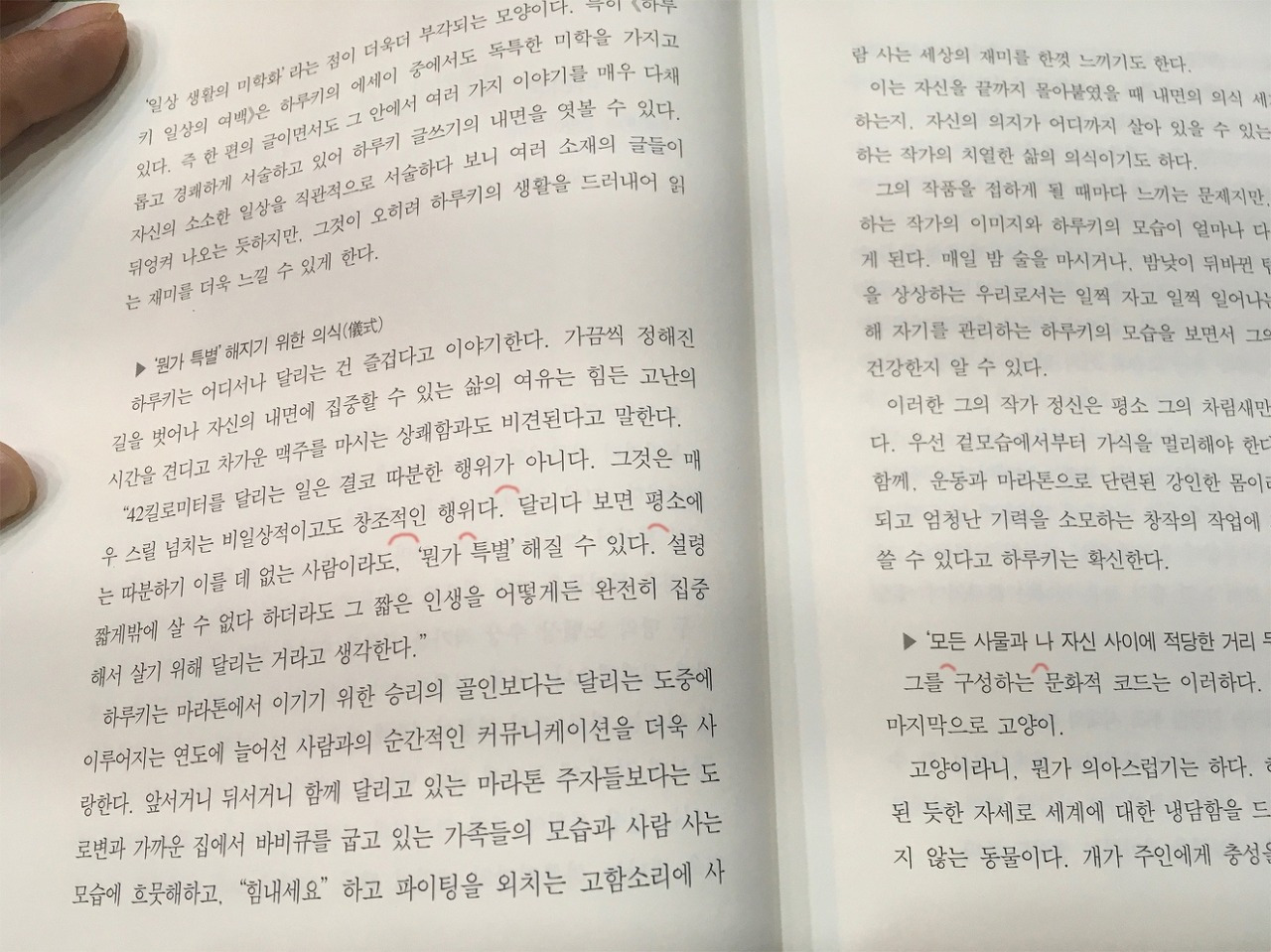 이 책의 타이틀이 ‘달리기, 고양이, 여행’이다. 하루키의 루틴 같은 생활의 습관과 태도를 통해서 여백을 채워나간다는 것을 알 수 있다. 그중에서 달리기에 관한 부분은 달리기 에세이 ‘달리를 말할 때 내가 하고 싶은 이야기’의 전초전 같은 모습이다. 하루키가 달리는 것에서 느끼고 얻는 것에 대해서 잘 말하고 있다.