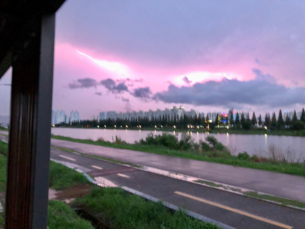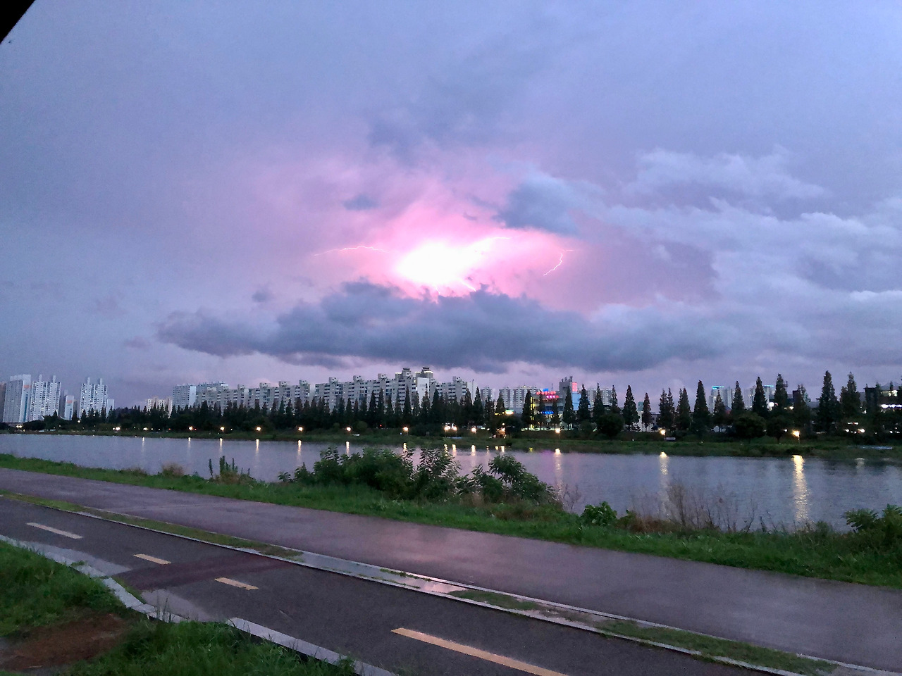 번개가 빠지직 저 멀리서 나타나더니 순식간에 옆의 구름으로 가더니 거기서 터져버렸다. 그러다가 몇 분 후에 또다시 거짓말처럼 등장해서 빠지직 굉음과 나타나더니 천지창조를 보는 것처럼 하늘에 흔히 볼 수 없는 컬러로 나타났다.