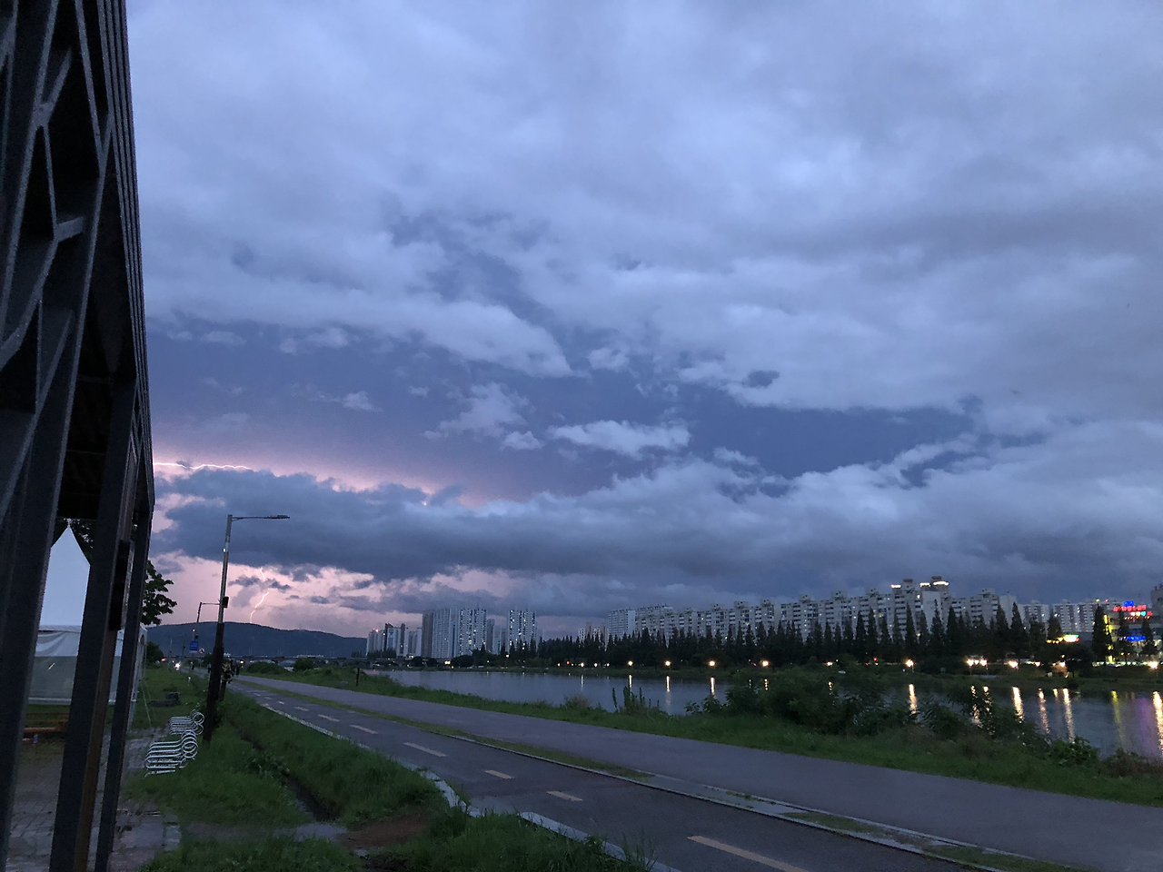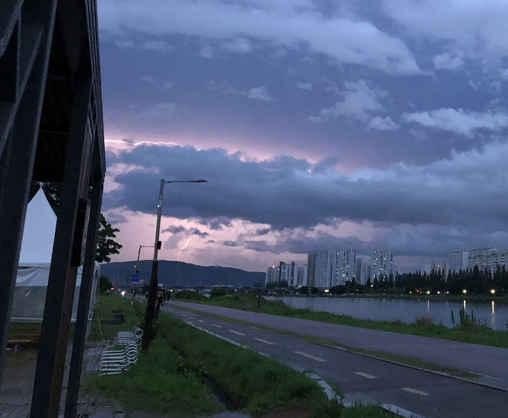 그렇게 30분 정도 거세게 쏟아지던 빗줄기가 가늘어졌다. 다리도 다 젖고 얼굴도 축축하고, 그럼에도 비가 쏟아지는 가운데에서도 팔 굽혀 펴기를 좀 하고 스쾃 같은 것들을 했더니 땀도 엄청났다. 비가 올 때 치던 번개는 세상을 그저 번쩍 하며 밝게만 했는데 비가 그치고 저 먼 하늘에서 빠지직하며 내려오는 번개는 상상 그 이상이었다.