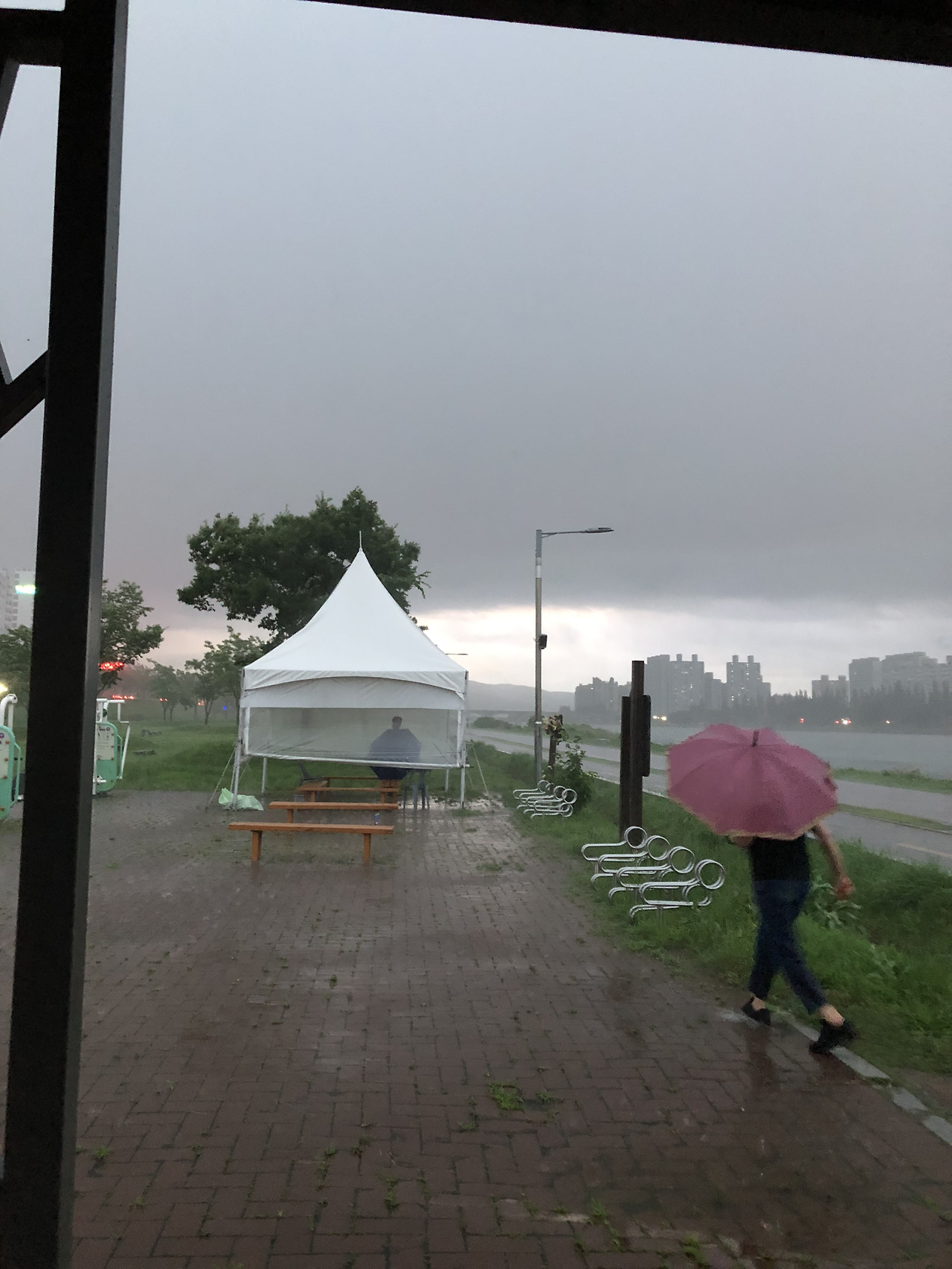 천둥소리가 초단위로 들리고 하늘이 번쩍번쩍 거리는 게 정말 다른 세상에 온 것 같았다. 강변으로 나온 어머님들도 너무나 놀라서 내가 들어와 있는, 몸을 푸는 곳으로 들어왔다. 우산을 쓰는 것도 의미가 없고, 비를 피하려 몸을 푸는 곳으로 들어와도 아무런 소용이 없었다.