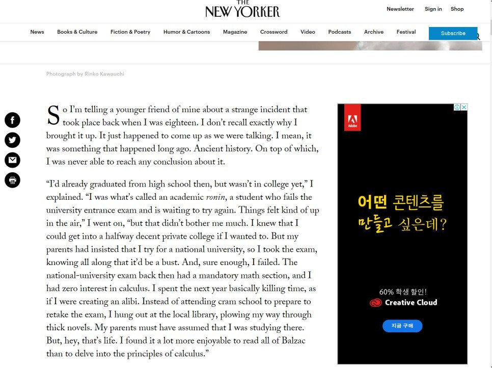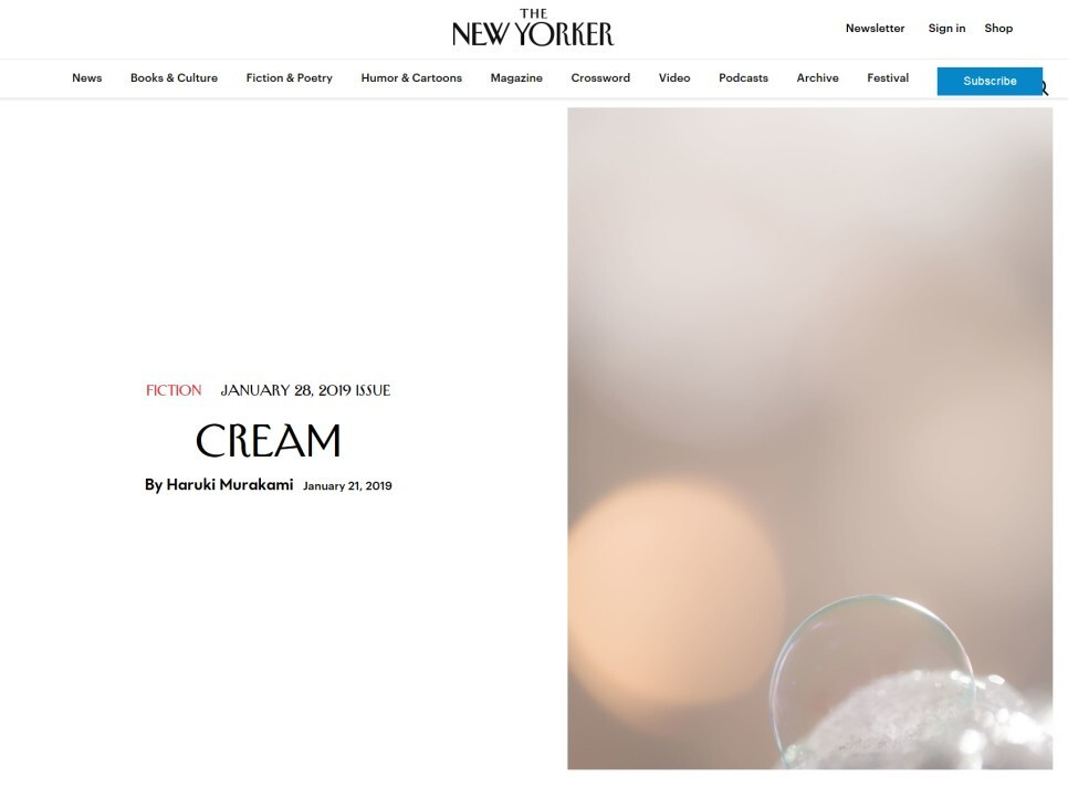 하루키의 ‘일인칭 단수’에 실린 신간은 한 편을 제외하고 2019년에 뉴요커에 전부 실렸다. 하루키는 언젠가부터 뉴요커와 밀접한 관계가 되었고 인터뷰를 종종 가지며 자신의 개인적인 이야기와 신간, 지나간 소설에 대한 이야기를 풀어놓는다. 뉴요커는 젊디 젊은 하루키 적 시절에 이미 알아본 거지. 아 이 사람은 세계적인 소설가가 되겠구나, 뭐 이런 미래를 보고 꾸준하게 하루키와 접촉을 해왔다.