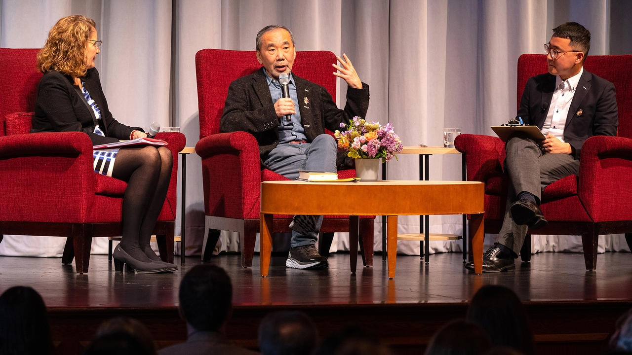 사진은 하루키가 강연을 마친 뒤 청중의 질문에 답을 하고 있는 모습이다. 일본어 교수이자 수지 뉴하우스 소장인 이브 짐머만과 스페인어 부교수 하기모토 코이지가 하루키와 함께 무대에 올랐다.