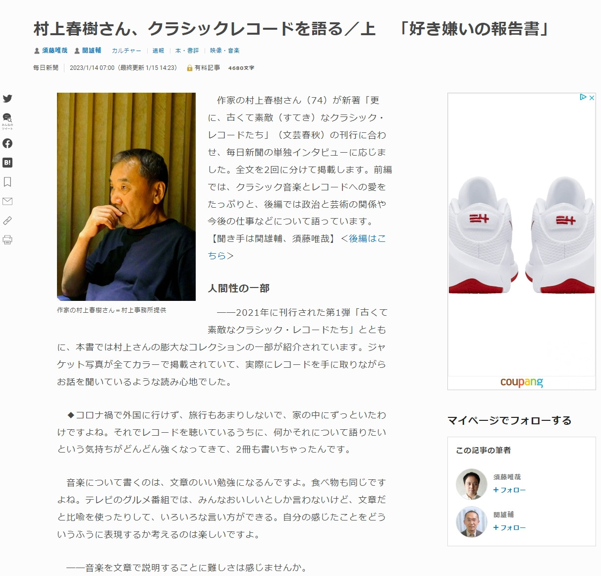 하루키는 2021년에 ‘오래되고 멋진 클래식 레코드’를 출간했다. 이번에 그 2편인 ‘다시, 오래되고 멋진 클래식 레코드’를 출간하게 되어서 마이니치 신문과 인터뷰를 가졌다. 아직 한국에는 소설도 출간이 안 되었는데 이러다가 클래식 2편이 먼저 나오지 않을까 싶기도 하다.