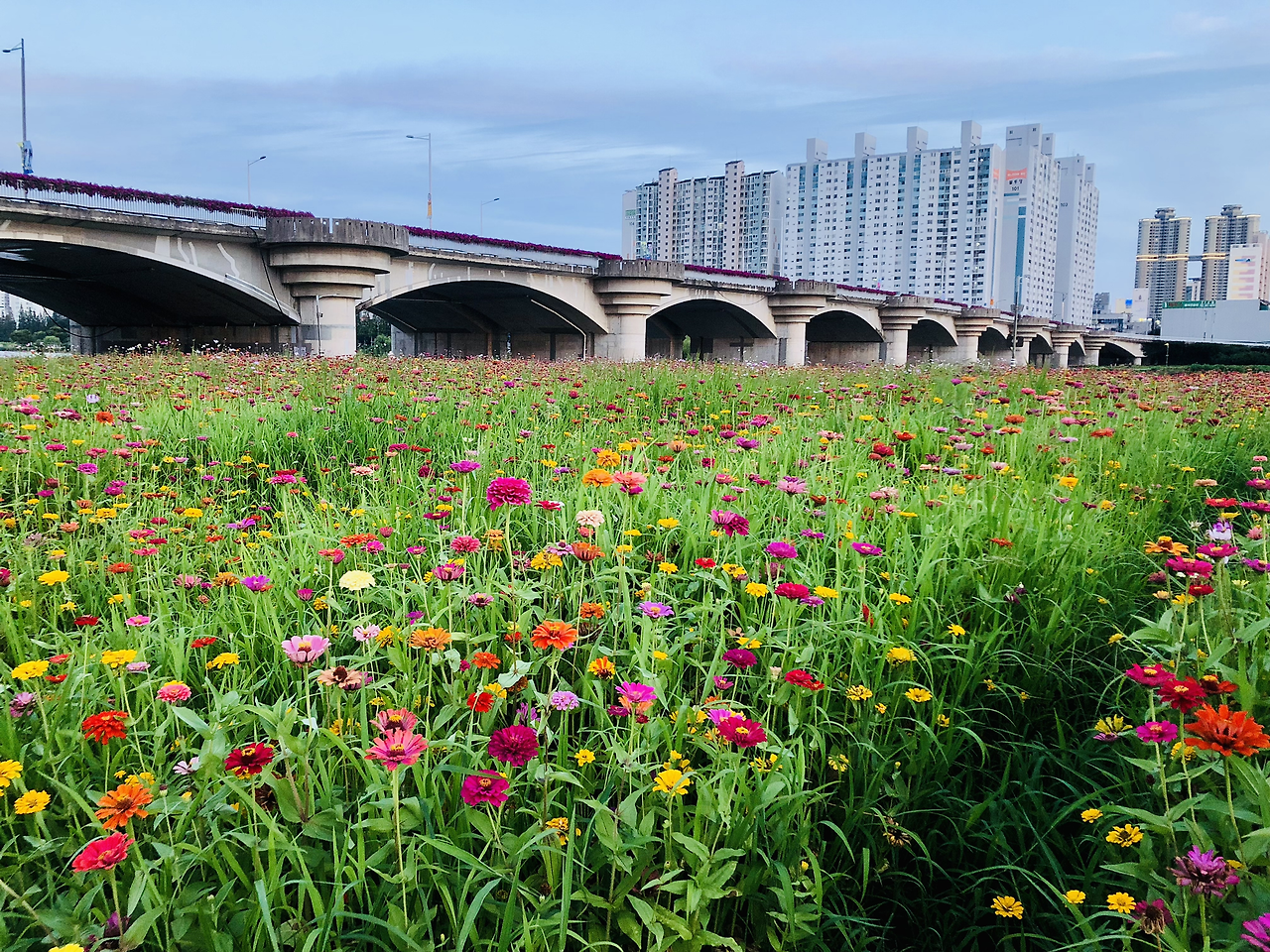이 부분만 이렇게 금계국, 만수국들이 가득하다. 꽃들은 왜 예쁠까. 꽃은 봄에 대부분 피는데 그래서 조금 예쁘지 않은 꽃들은 봄에 외면받는다. 너무 예쁜 꽃들이 봄에 다 피어버리니까. 그렇기에 어쩌면 제일 예쁠 시기에 외면받아서 슬플지도 모르는 꽃들이 있다. 하지만 봄날만 피하면 이렇게 예쁨을 활짝 드러낼 수 있다. 하찮고 흔한 꽃인데, 그래서 더 예쁜 것 같다. 꽃들을 보고 있으면 인간과 다를 바 없다는 걸 느끼기도 한다. 설증매가 아름다운 이유가 바로 거기에 있다.
